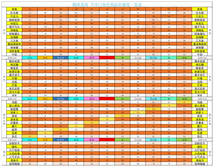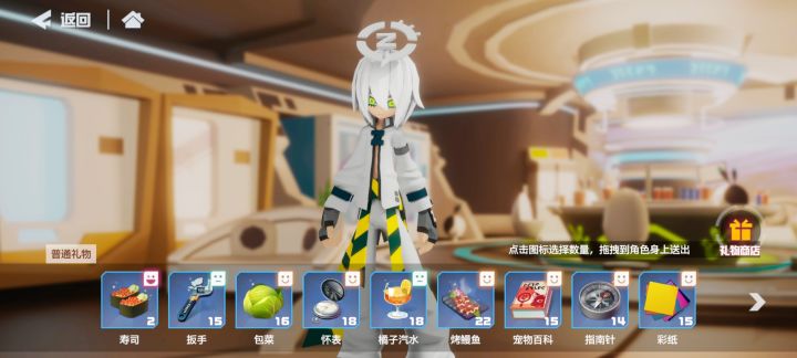 最喜欢的是寿司(400礼物就开出来了3个寿司?这爆率感人)喜欢是+24 一般是+18不喜欢的还会+4是个 真·天使 不会扣好感度图文版的在下面超爱:寿司(+30)喜欢(+24):包菜/怀表/鳗鱼/宠物百科/指南针/彩纸/玫瑰酥/三文鱼/蜂蜜茶贺卡/鸡腿/猫猫/哈密瓜/柠檬/法棍/蔬菜/芒果/烤串/饭团/海鲜/牛奶/爱心便当一般(+18):南瓜/润喉糖/扳手/橘子汽水/折纸/蔓越莓曲奇