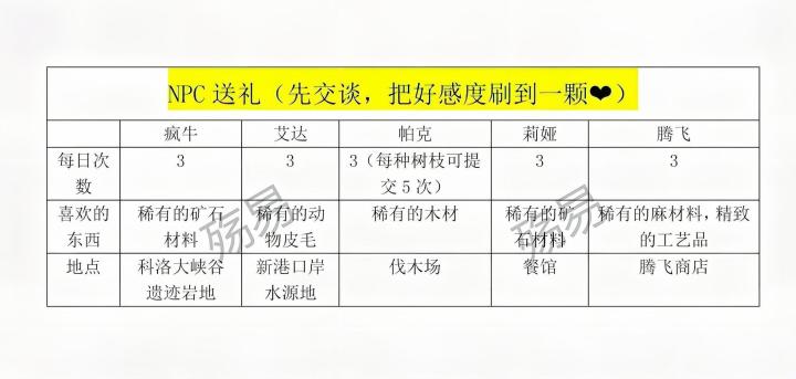 有谁知道送礼该送些什么吗?好像每个人物都有不同的礼物,求送礼攻略!!!