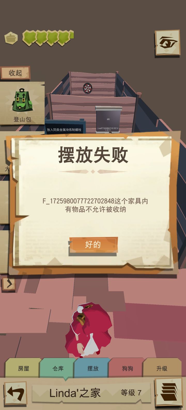 分享箱子bug解决方式:(官方群给的) 将异常保险箱内的物品全部移出,再进入摆放模式重新摆放箱子,即可恢复正常。 可以看下哪个保险箱在进入摆放模式时消失,但退出摆放模式后又出现,这个就是异常的保险箱。