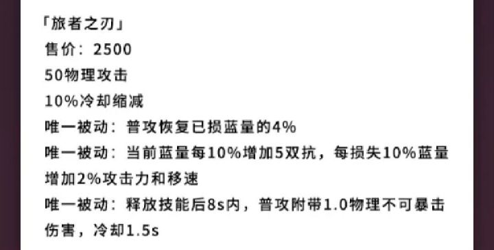这几天策划的乱调整出装,大部分物理装都削了伤害加强攻速。曾经龙牙能用半肉物理装薄暮之刃加强一点伤害,但是40秒的CD和狂削25%的血量,中后期完全跟不上节奏。旅者之刃直接改成:没蓝条你出桃子。斩舰伤害低至25,纯腊(憨)机装。破刃又相比以前削了10伤害,加强点移速,勉强能用。减疗蔷薇伤害也削了伤害,加强了穿透(不过减疗这玩意我也一直没出过蔷薇,半肉龙牙出个反甲都够用了)而且看ty这死