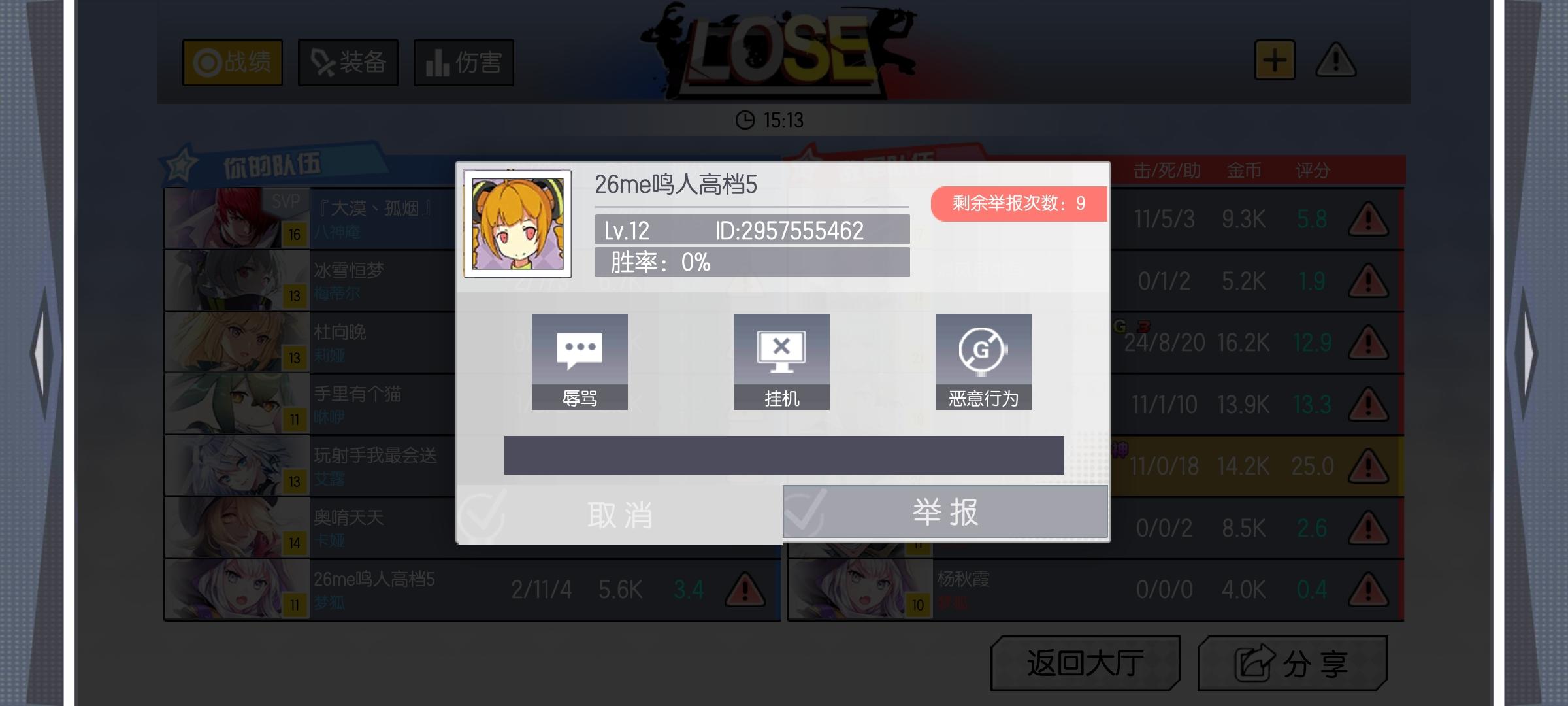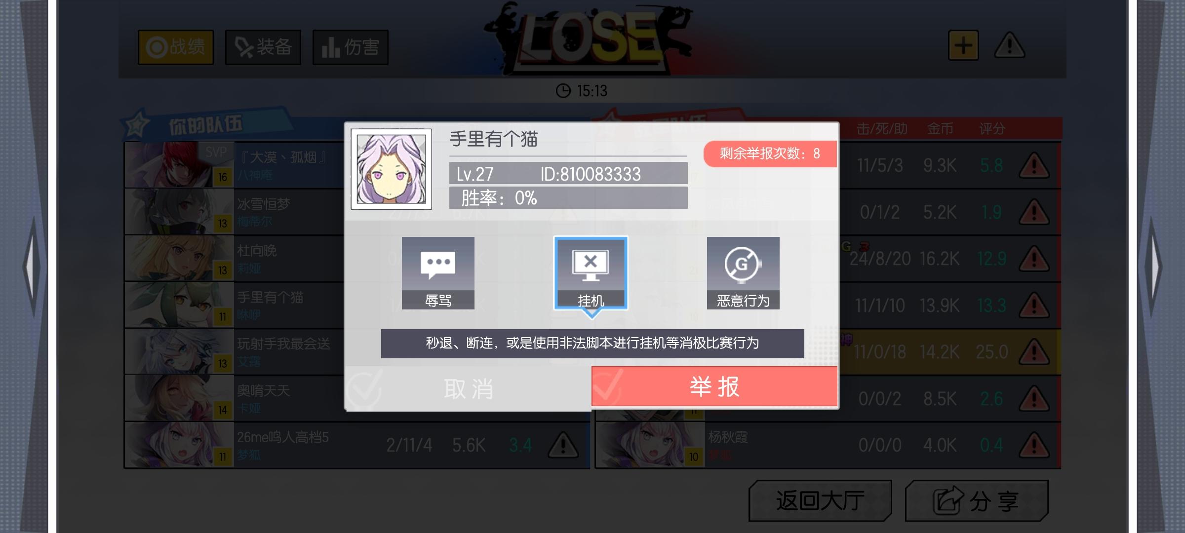 建议这种娱乐挂机且零胜率都是0%的直接禁赛,只能打人机,一把七个人就两三个是活人,学校娱乐时间本来就不多,玩把娱乐整个人都不好了