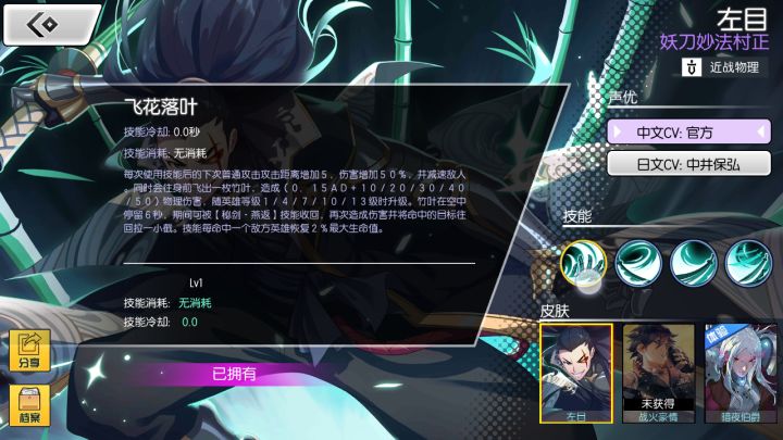 首先了解一下他的技能,接下来直接写教程(仅供参考)(大佬勿喷) 左目(被动图一)开局建议点一技能(请参考图二),能磨人,(大佬开局点二技能勿喷)因为左目技能位移距离真的很……开局先放个一技能,既可以小段位移,也可以屯个剑气,如果看到敌人,先用剑气攻击发出叶针(请参考图二),再次使用一技能可以将拉过来,当然,只有一技能时建议磨,不建议正面刚,(大佬除外)当你有了二技能之后就可以……更牛逼的……