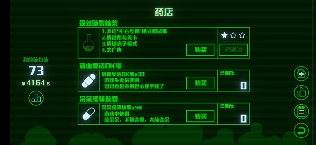 已经2022年了,tap上依旧没有脑裂,于是去某歌商店看了看,还真的有,于是下载下来,玩了几关后发现有广告,后来发现可以购买去广告于是想购买,但是打不开界面一直白屏,想了想打算来tap论坛看看,结果发现好像官方的修复之类的好像跳票了😑😑😑