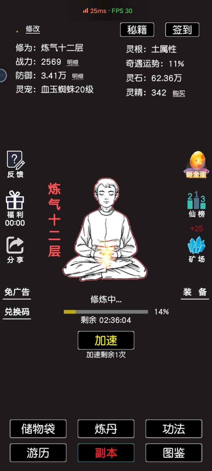 应该给功法给个增加修炼速度的特性,而减少其对于战力的直接提升,然后增加境界的加成比例,这样一来一回数值没有明显变化,而且更加合理,让功法的作用更符合小说设定。另外新境界功法的获取问题。我是把练气期能练的功法练满,能打的副本都打了之后,才勉强升到筑基的,因为入魔的几率太变态了。这之后就存在着一个问题,刚升到筑基没功法练,战力也没随着大境界提升大幅增加,副本打不了几层,获取不了新功法,增加不了战力,