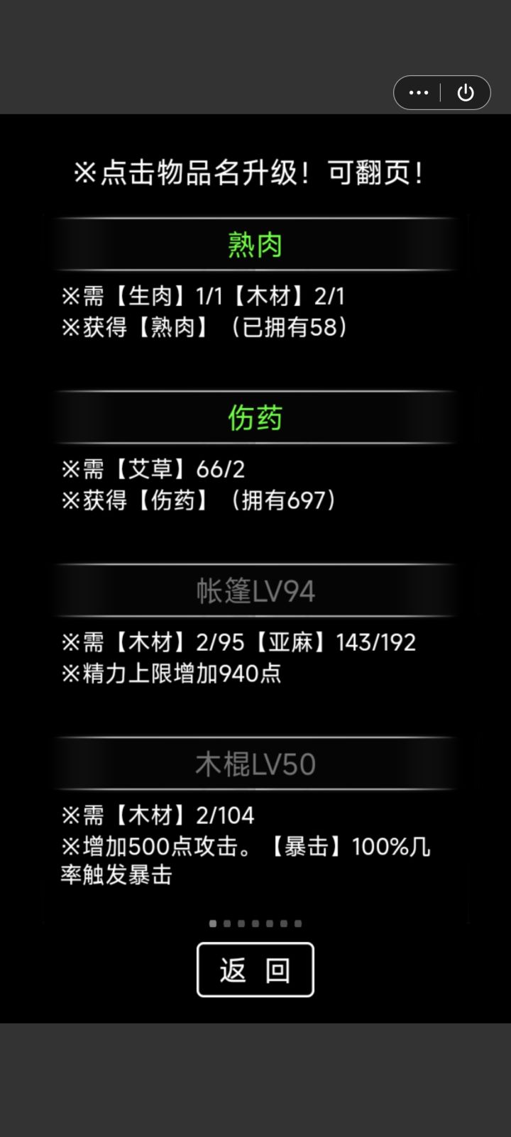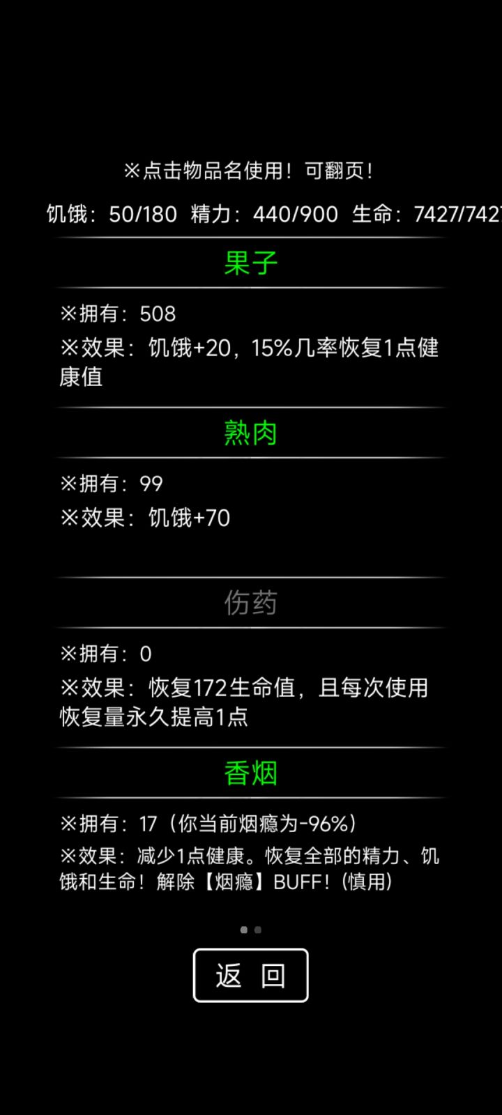 关于游戏机制:1.sl:随机事件全选战斗选项,敌人太强可以从后台退出,重进游戏后敌人消失2.饱食度不足时自动吃食物,随机选择,但吃肉会少给10点饥饿值3.暴击:自身伤害+50%防御:等量减少伤害荒野(0-99km)发育策略:主要做帐篷,多余木材做木棍。木棍3级以后升1级麻布衣,之后艾草全做药,血量<70吃药。固定事件:第3天-铁罐滚落:出门,进入战斗第7天-袭击:迎战,进入战斗,
