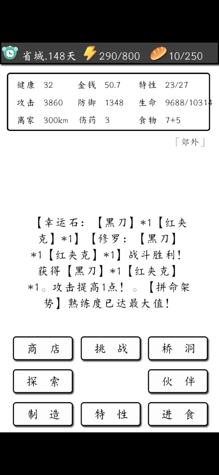 我自己打了167个小时,是都通关了,先放结局,在这给新手玩家一个建议:开局愣头青,在荒野时,把能打的都打了,第七天有一个精英怪要打过的,打不过就要重开重新打,到了省城,第二天就会有一个小boss,那个不一定要打过,记住出省城之前之前黑刀一定要1级以上,80天左右起码4级黑刀,一定要的!不然boss打不过,属性方面跟其他大佬一样,主升房子,木棍比房子低个一两级,太低没伤害也不能太高,太高房子等级又低了,衣服卡3级就行,等后期房子十五级以上,再去做它,途中可以在250km左右可以遇到电锯男,他是掉草衣的,打他一定要在伤害450以上,不然会被他秒,后期到300km,先存钱把几本书买了,再去把锻炼提高,精力也是,到400以后精力就不用了,全加在锻炼上,一百七十天,匕首最好升到15级以上,防御最好200,攻击最少4000,血量最低5000,枪在这个时候也起码二级,不然boss打不过,boss30万血,是逐渐变强,尽量5次把他秒了,不然也搞不过