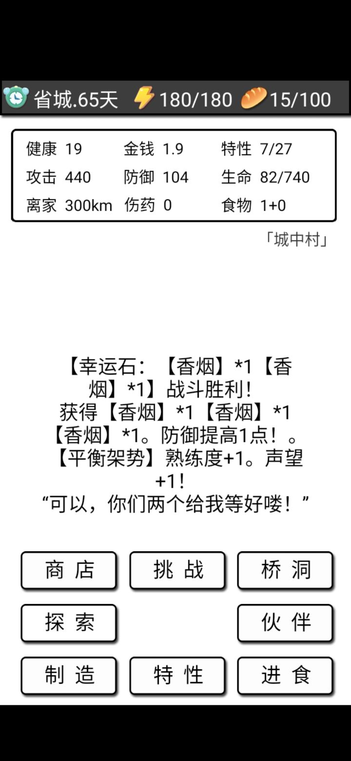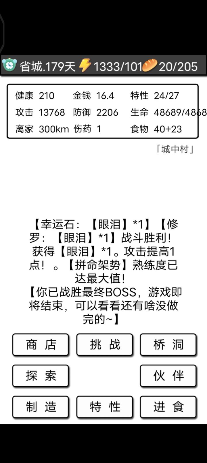前期主升帐篷,除了小蚊外其他全部不打,练逃跑率,吃15个伤药后就不吃了,进入100km后用钱升两级皮衣就可以打蚊子了,多余钱全升精力,事件可以全部不打,属性高量力而行,33天后存钱买黑刀,之后直接前进。