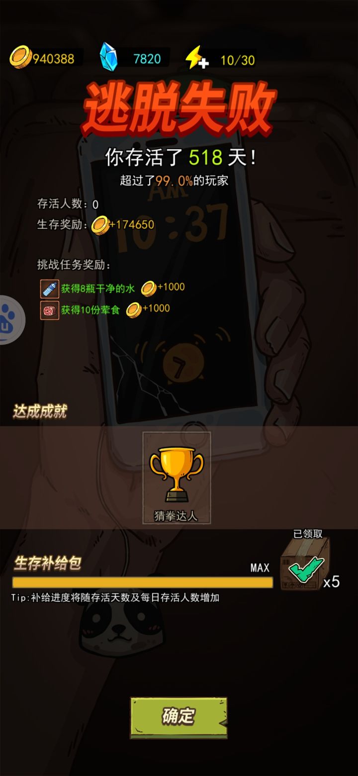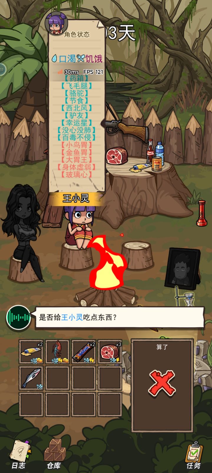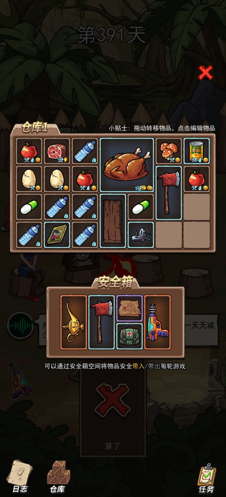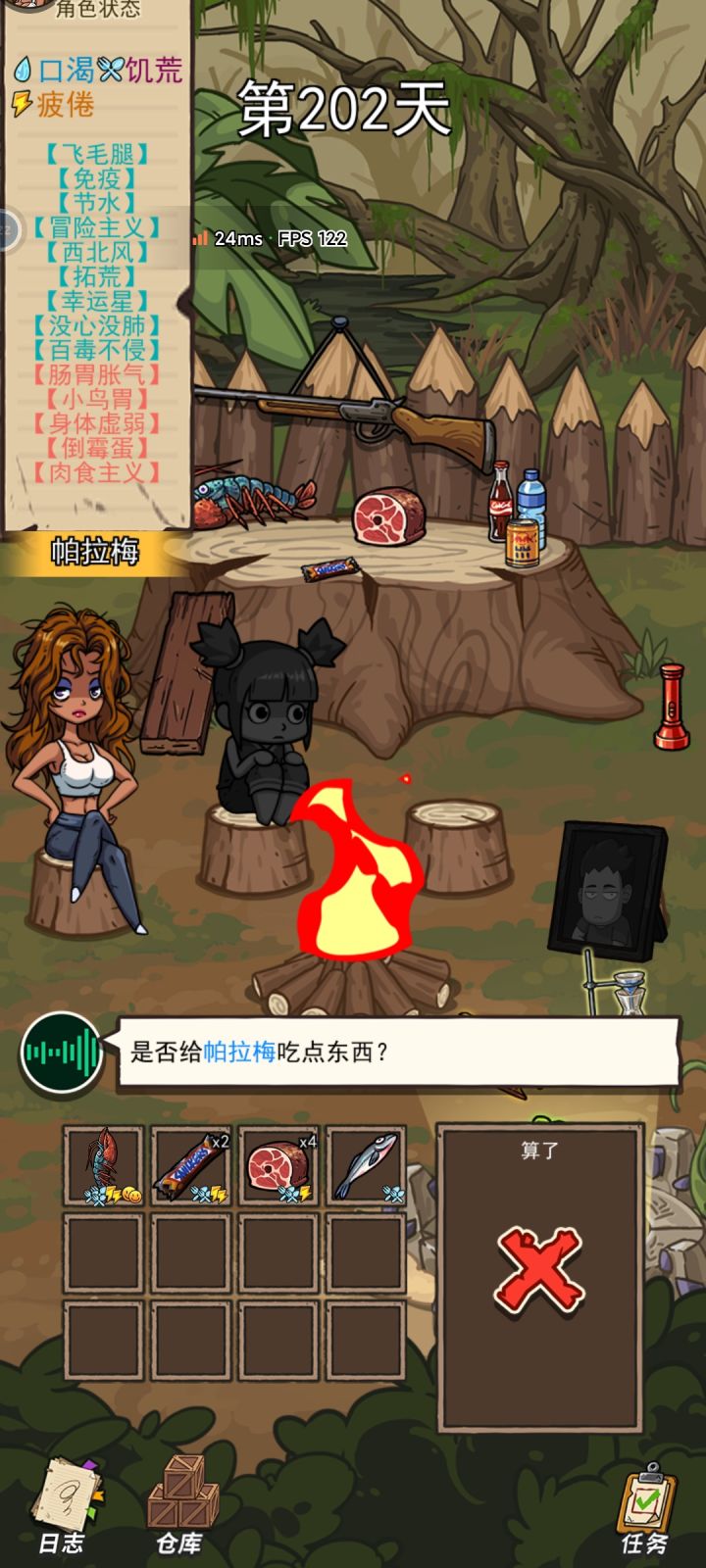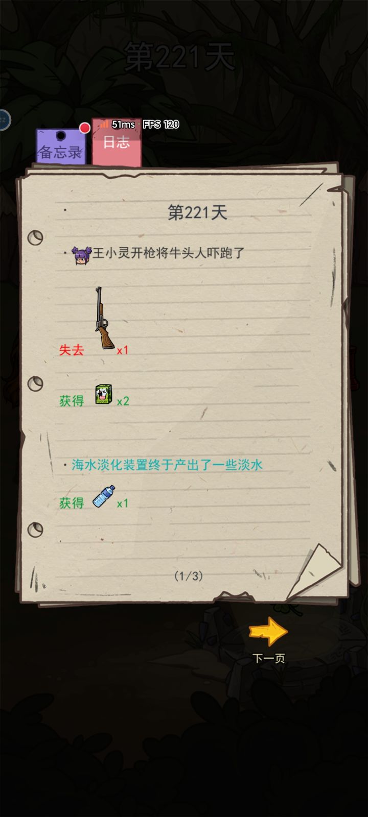 200天留恋一下,不看广告只sl。王小灵真太坑武器了,出去两三躺就掉一把。双武器都保不了多久。掉了没多久就刷牛头人,吸血鬼,跟海盗。。每次打跑只要是小灵拿枪必掉。。无语。。4人开荒没多久,波波疯了跑出去还是被牛头人抓了。。乐乐渴死。。剩下的好吃好喝活到200天。。想凑2贝壳全拿去换武器了。。遥遥无期。。