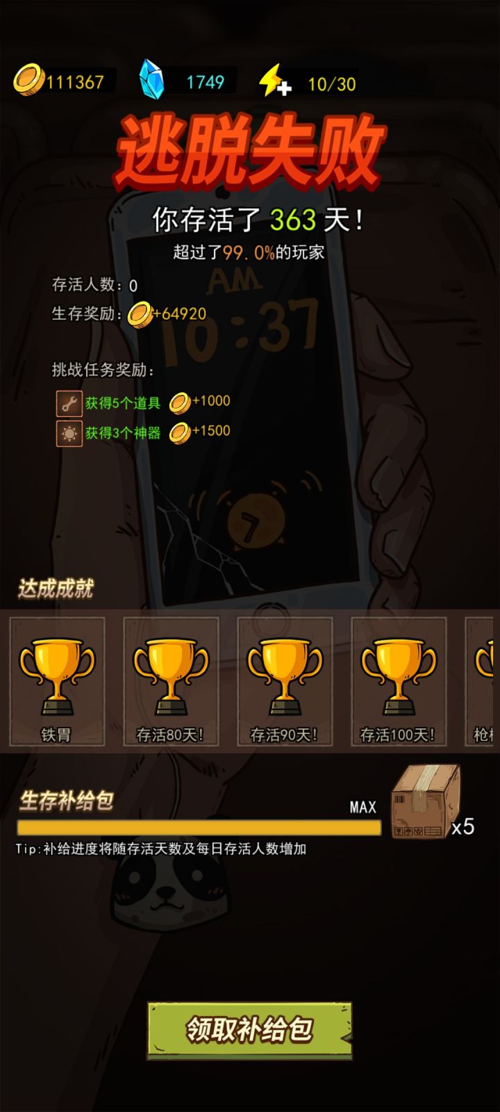 364天,不是手贱开门的话肯定能狗到500天拿非卡bug榜一。增益全技能一个不落,不吃不喝不生病不难过根本死不了。还攒了好几把激光枪,死不了,根本起不了。
