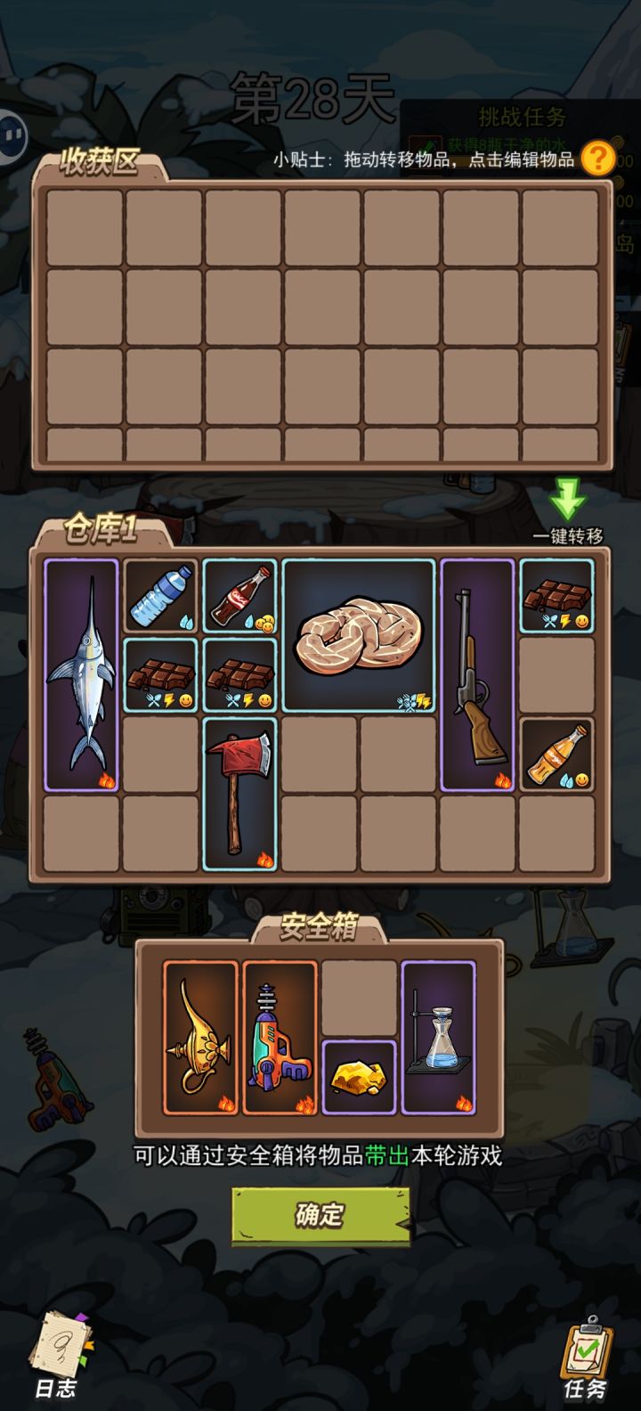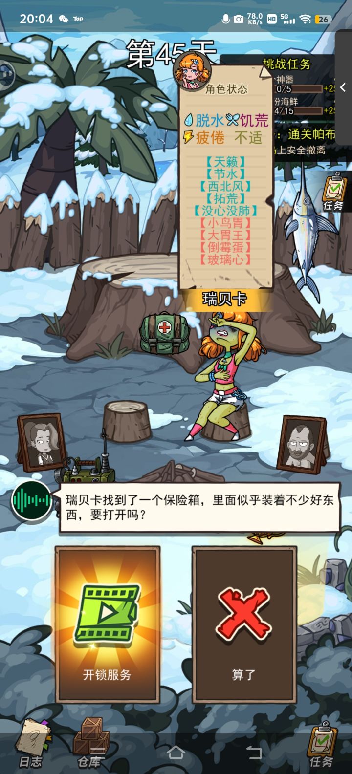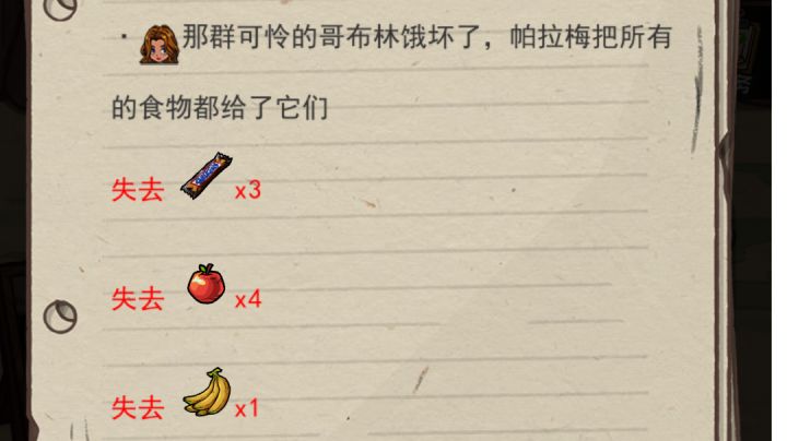【仓库虫子开始吃食物,丢弃】好的——失去虫子算了——后续失去一些食物在获得一些虫子,然后再重复一次选择(死一条虫子,获得两条虫子)【麻袋哥布林】购买宠物——熊猫&恐龙算了——无【哥布林——猜贝壳】猜中获得一个贝壳,猜错失去一瓶水算了——无【奸商哥布林,武器】换6瓶水或6条鱼算了——无【黑哥布林,喝芦荟汁】好的——算了——无【厨师帽的哥布林,品尝】好的——九转大肠算
