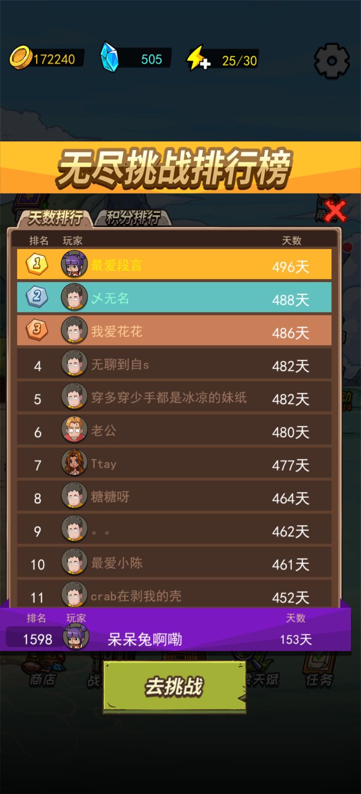 小心翼翼掰着手指算天数,玩了四天的五百天,根本没有上榜😨失去玩下去的动力了(果然不该开箱子会炸的。。。。)