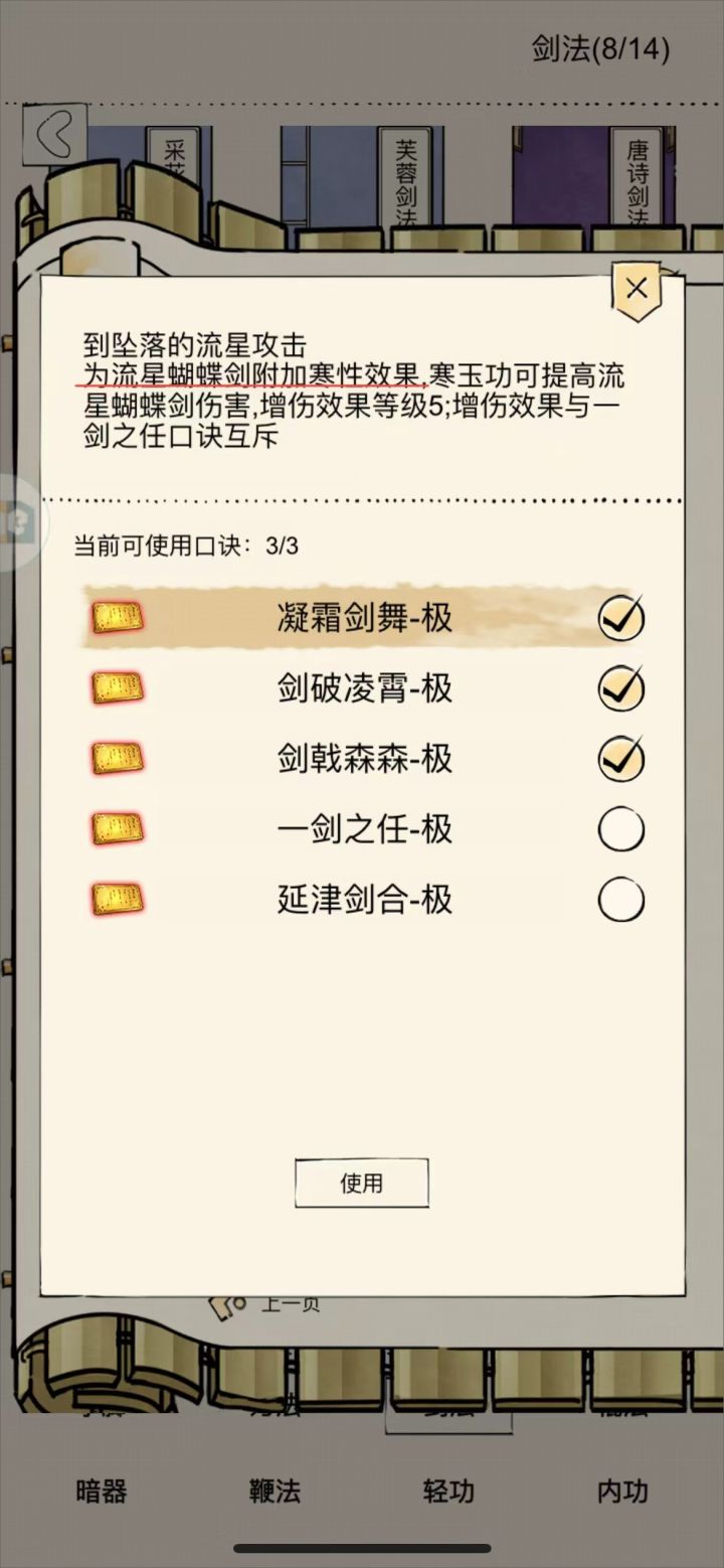 同样是寒性武学凭什么飞雪可以享受寒玉的全部直伤加成效果,300内功太白经跟300内功寒玉功对飞雪加成伤害一样。流星蝴蝶剑凭啥就不行,携带口诀(凝霜剑舞)极那流星也是寒性武学啊,凭啥300寒玉伤害就比300太白低那么多!更何况在附带寒性效果的同时,后面还说明了增加流星蝴蝶剑伤害5等级,那携带内功300寒玉功伤害不是更应该大于携带内功300太白经吗?