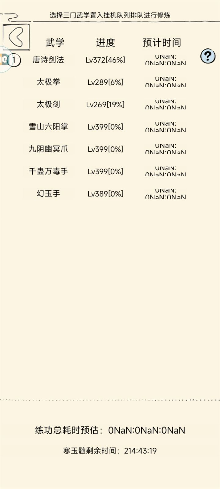 昨天早上玉女剑修完之后,让我有点震惊,一躺床上发现修炼武学时间变长了,但我的加成一个都没少,这是咋回事啊?直到现在第二天凌晨三点多才变回来