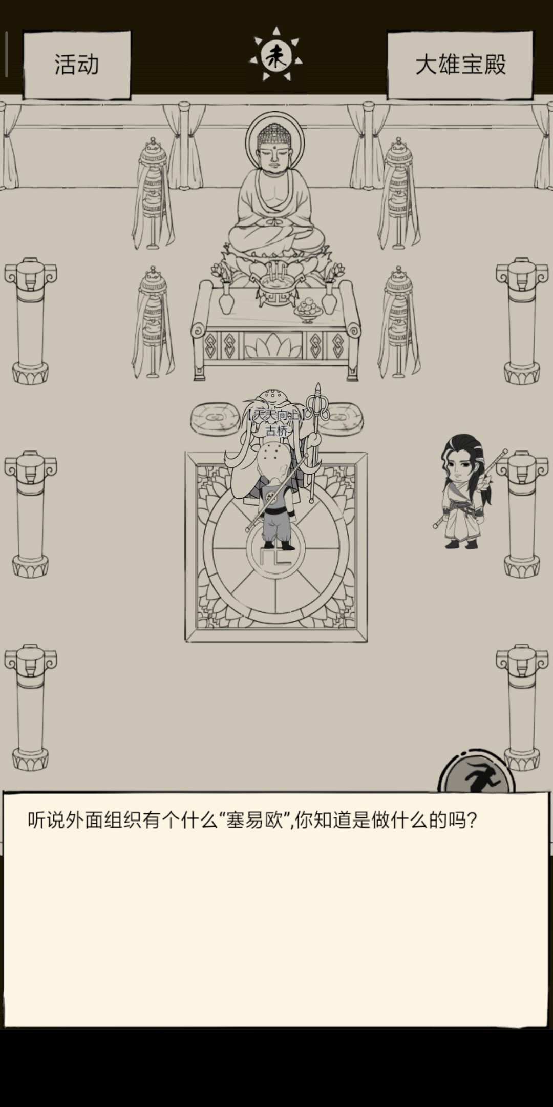 说了几次话都没用,独行侠也说过了,和村长说话他叫我去约笔友,是不是方丈被困在华山上面所以才触发不了(但是我好像打不过那几个坛主_(:3」∠❀)_)大佬们能不能支个招