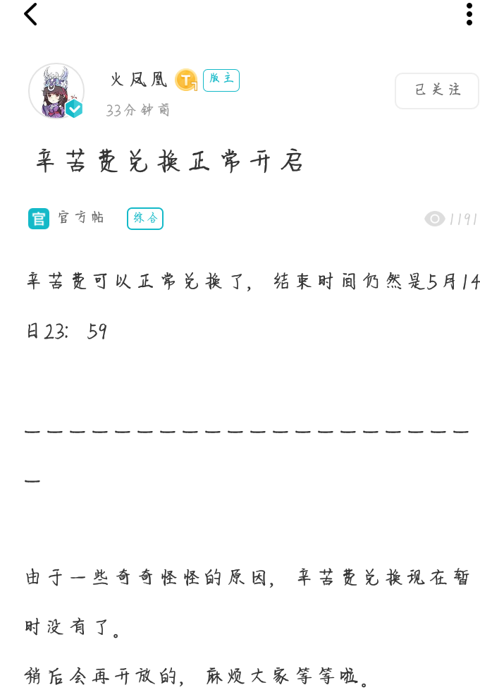 今天看到帖子不少人都在抱怨官方辛苦费兑换的bug,所有我就来氵帖…呸呸呸,一会就开放了,大家等一下吧,嘿嘿嘿,不知道会不会有补偿(水帖大王)