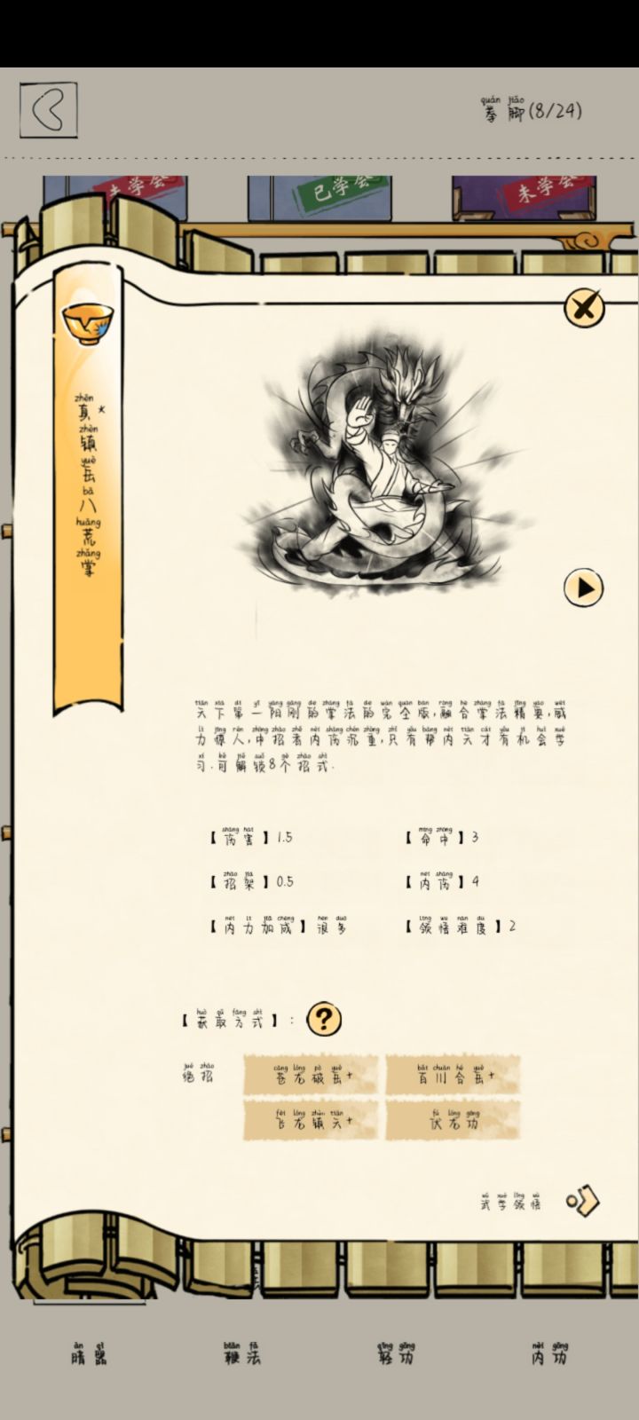 降龙八荒掌>>镇岳八荒掌>>御麟九囿掌亢龙有悔 >>飞龙镇天>>灵囿藏威见龙于野 >>苍龙破岳>>麟威慑野利涉川泽 >>百川合岳>>囿锁蹄痕#暴走英雄坛游戏软件v10