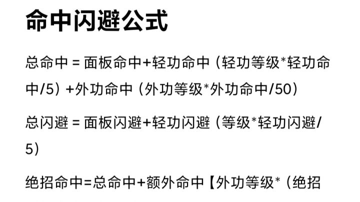 数据引用帖子:【攻略】命中闪避篇——寒宵说江湖系列(一)https://www.taptap.cn/moment/445901256481835899?share_id=1fad65f3cc0a&utm_medium=share&utm_source=copylink上面这是官方发的帖子,如果以官方说的为准,把公式套进去,就会发现公式是错的这里应该是/10,而不是/5。改成/10之后,上面的