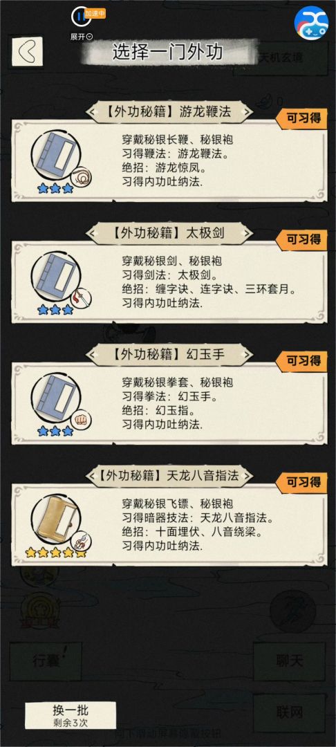 仅供参考,毕竟牛人很多,我是菜鸡先把无量天机分为:打过步步危机,打过危机重重,打过大侠,打过海底,林冲党和月卡党一定要会打无量天机,换取物资加快进度打不过的原因:1.天赋低或者不会点2.没有选到合适的武学和宝物,确定一套武学后优先宝物3.运气差没有sl因此不用刻意打高难度导致浪费次数必备小知识:1.亮晶晶的星星是物资,必捡2.身份选商人或者苦行僧(天赋不要解锁药王,拖节奏)商人开