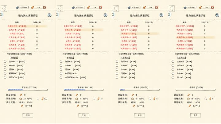 ☆目录:1、装备洗练窍门2、基础知识:重铸与洗练3、洗练出的词条简介4、洗练的侧重点5、适合平民、正常玩家和氪佬的三种洗练模式6、B、A、S精华的获取与基本知识7、在乌金的时候直接重铸S并洗练,还是到了玄铁再重铸S并洗练?8、装备邪修:双四维………………………………………………1、开篇直接讲干货,装备洗练窍门:每次!进入顺天府的铁匠铺,直接在心里默念:不要上头!不要上头!不
