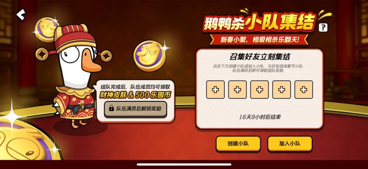 快来组队,还差4我的组队码:4m1o75ih。新年小聚别瞎逛!和家人朋友玩一局鹅鸭杀,相爱相杀迎财神,限定皮肤一起拿