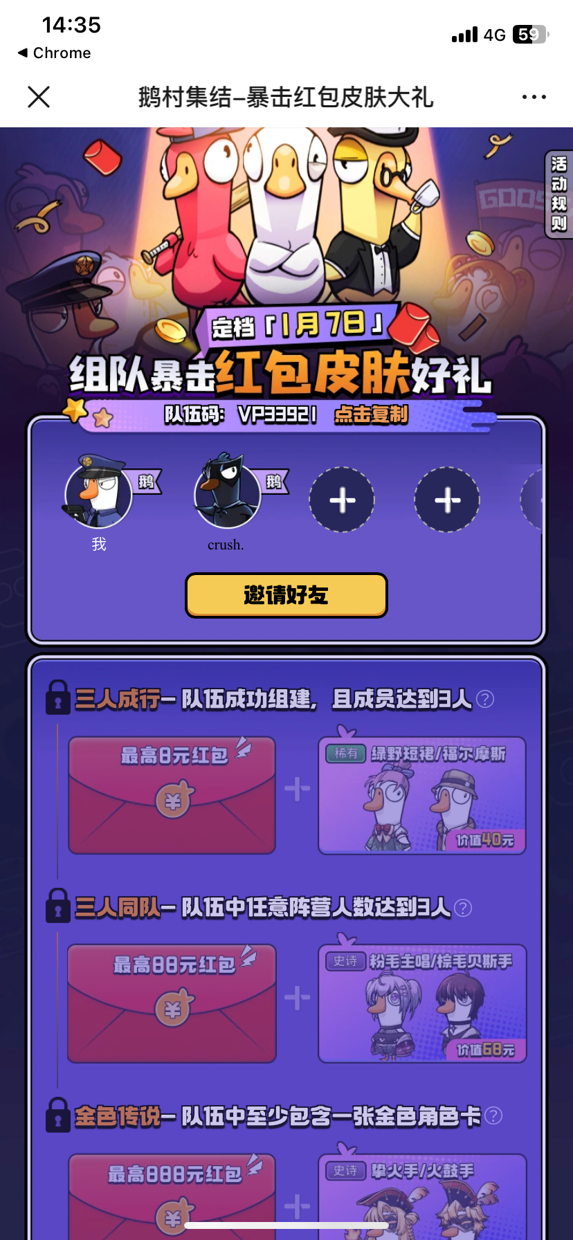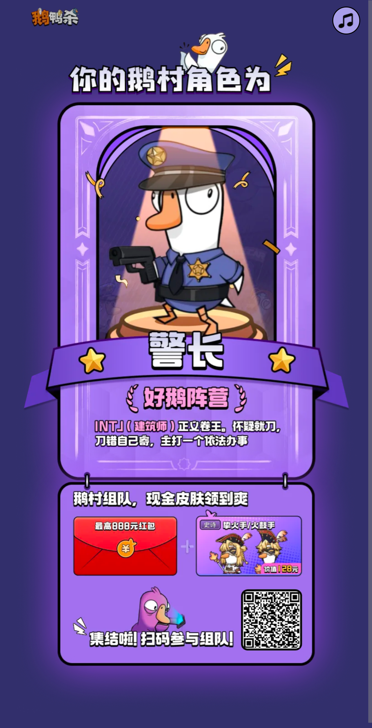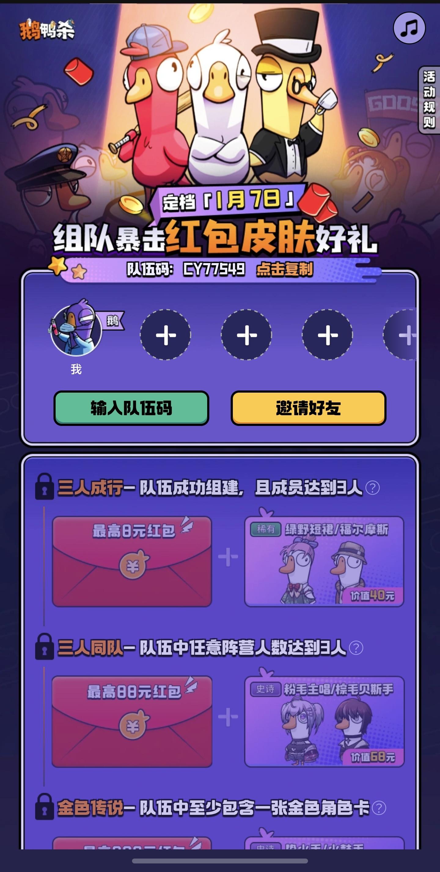 鹅村集结-暴击红包皮肤大礼https://cdn.yyb.qq.com/mole/app-activity/goose-goose-duck/index.html#/?team_id=SS49512&channel_id=yyb_topview
