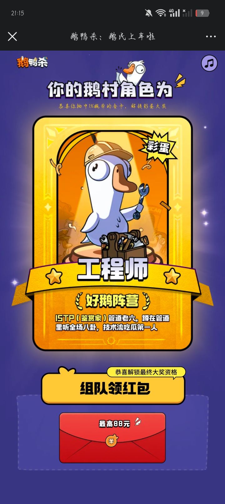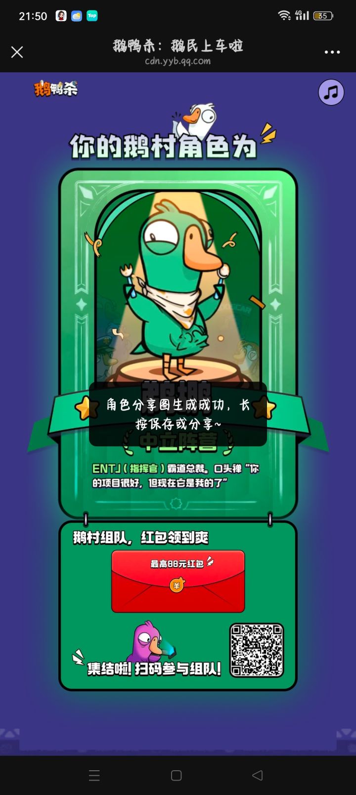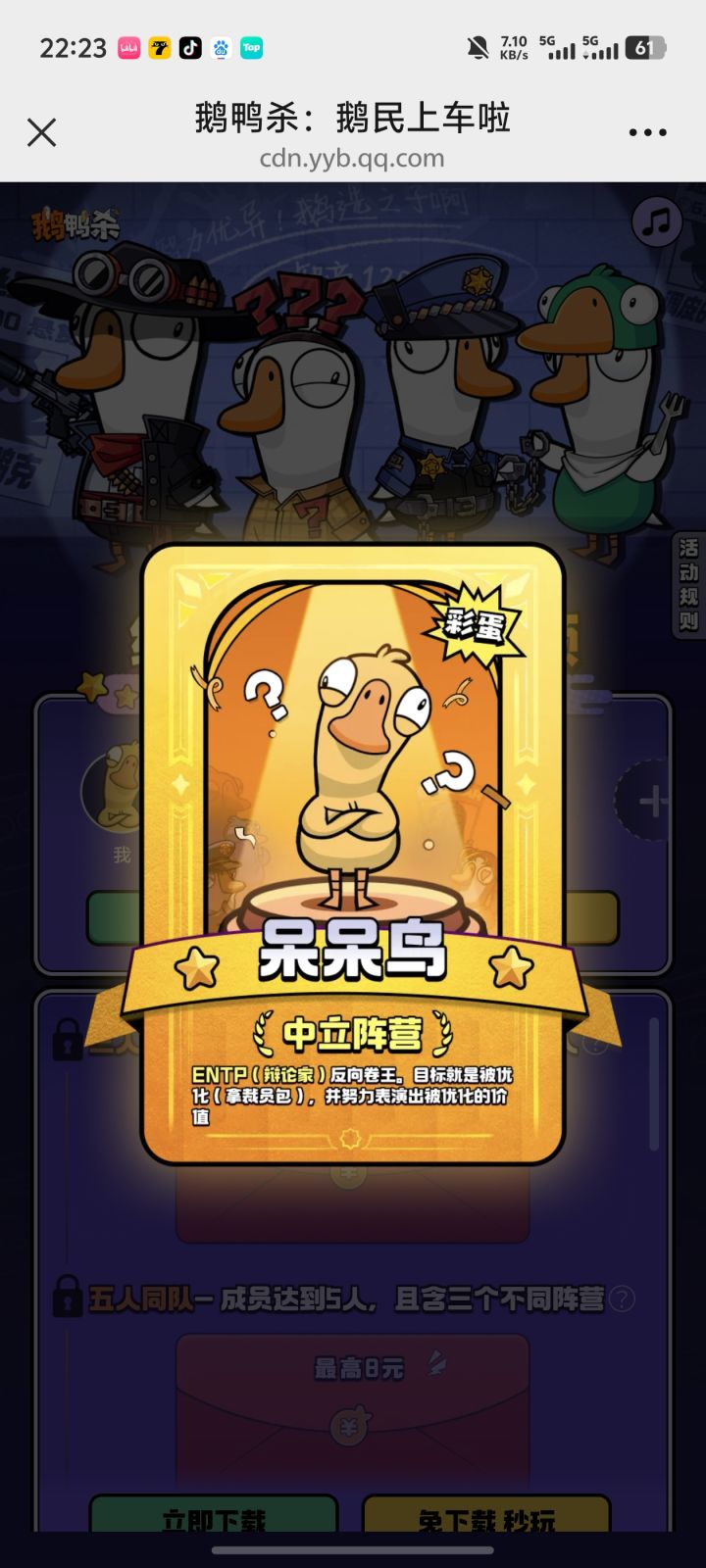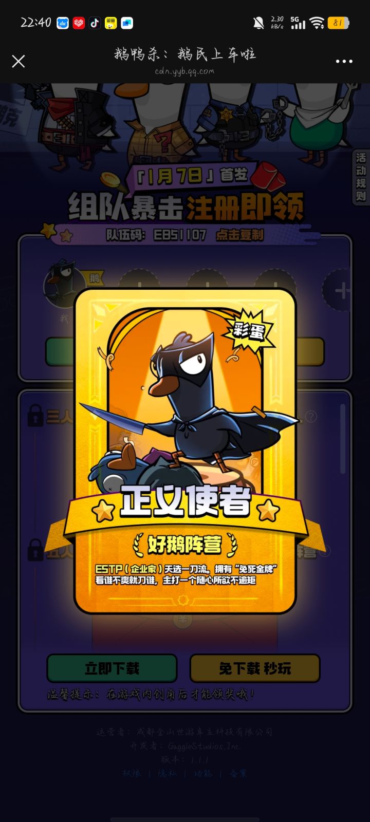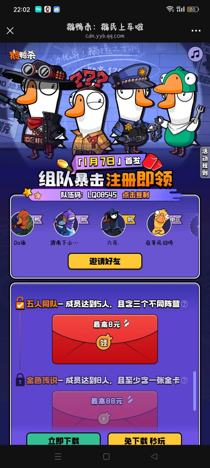 鹅村集结-暴击红包皮肤大礼https://cdn.yyb.qq.com/mole/app-activity/goose-goose-duck/index.html#/?channel_id=guanwang&team_id=DV84915