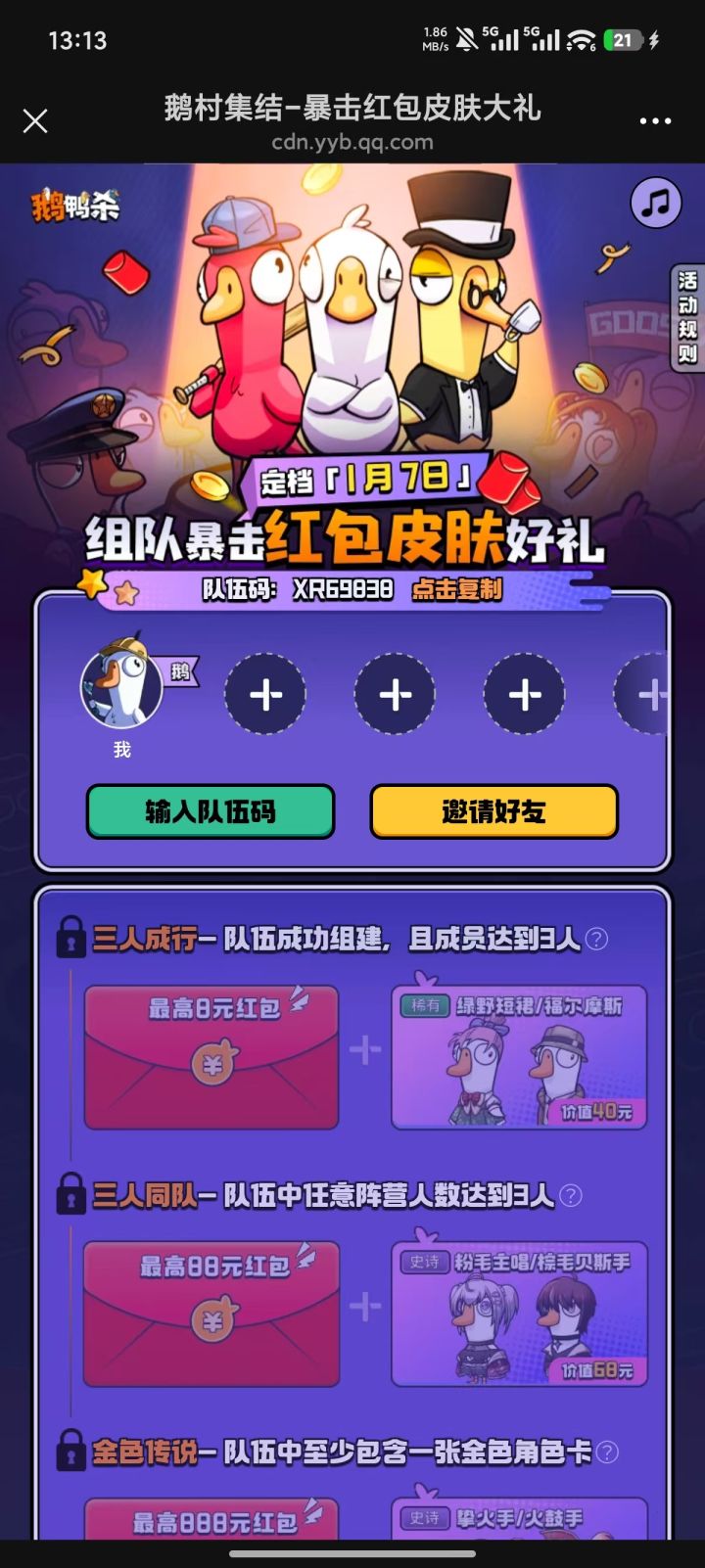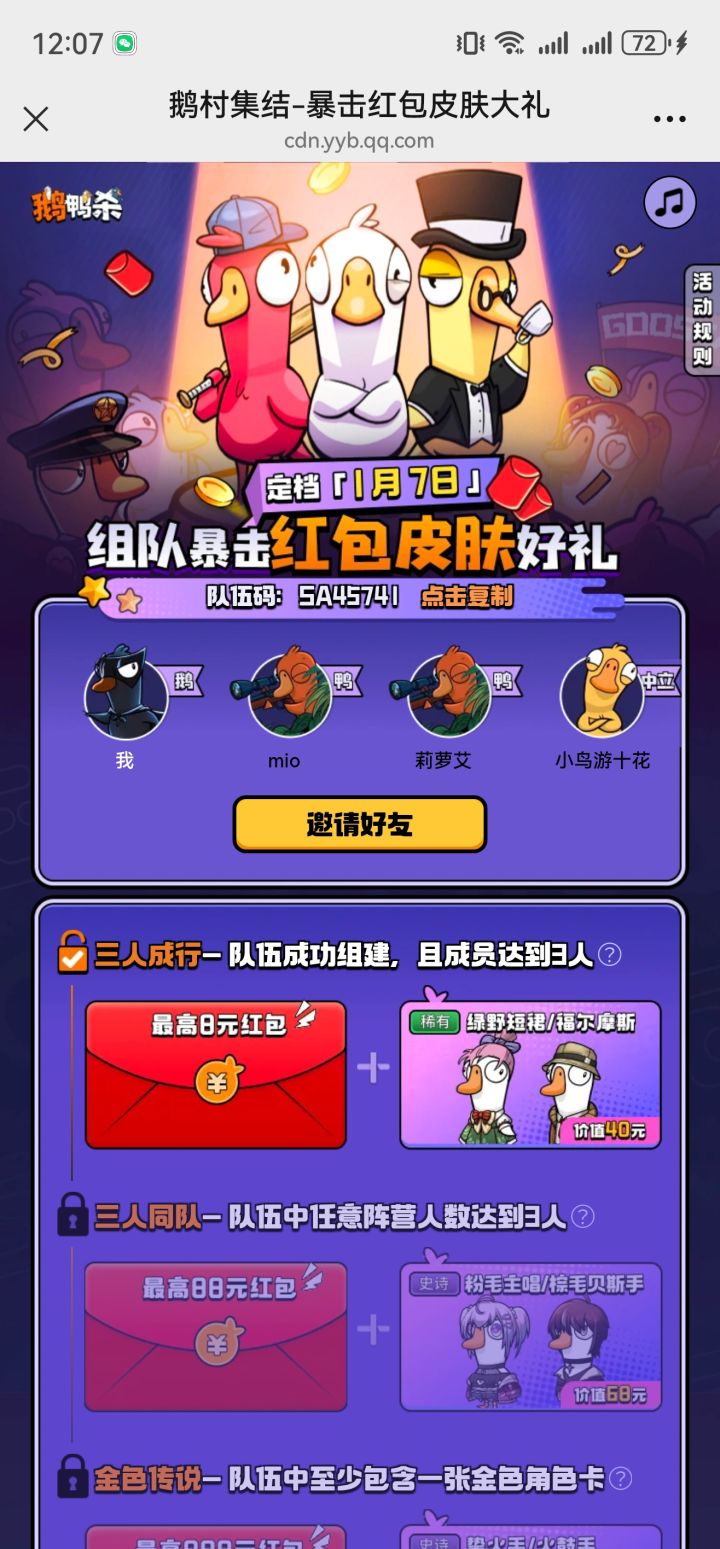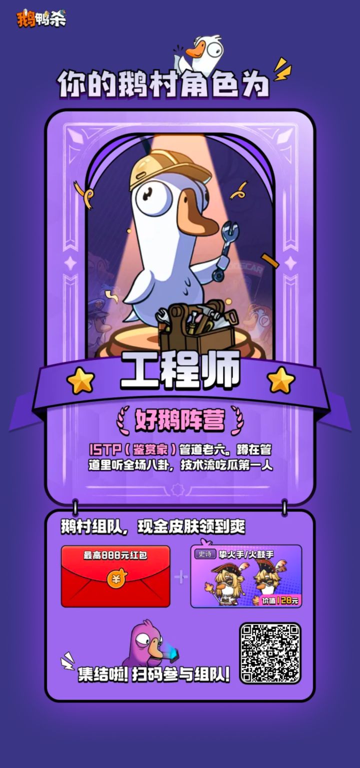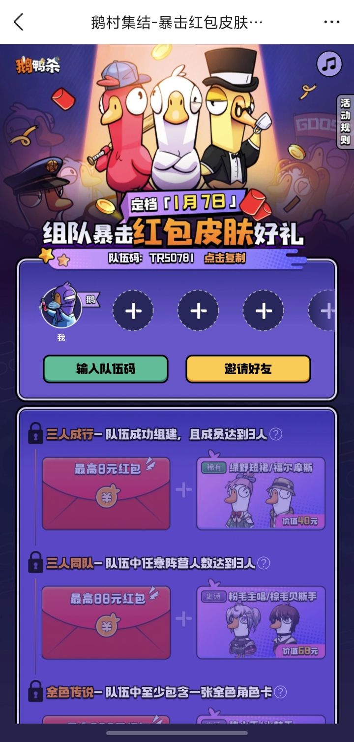 鹅村集结-暴击红包皮肤大礼https://cdn.yyb.qq.com/mole/app-activity/goose-goose-duck/index.html#/?team_id=SS49512&channel_id=yyb_topview