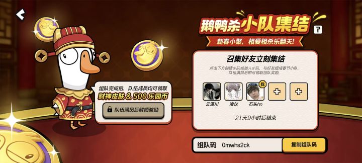 我的组队码:dssbjn6o。新年小聚别瞎逛!和家人朋友玩一局鹅鸭杀,相爱相杀迎财神,限定皮肤一起拿