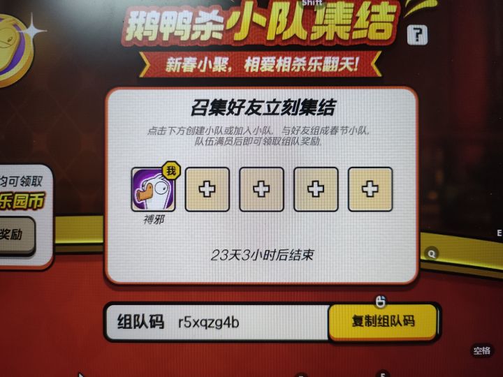 进来一起拿皮肤我的组队码:ehjd7asz。新年小聚别瞎逛!和家人朋友玩一局鹅鸭杀,相爱相杀迎财神,限定皮肤一起拿