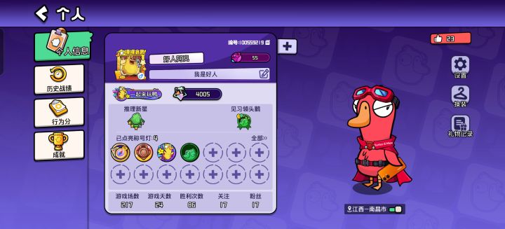 国服鹅鸭杀玩家ID:100804249圈子ID:100804249每天晚上组局有一起的么,可以加好友。