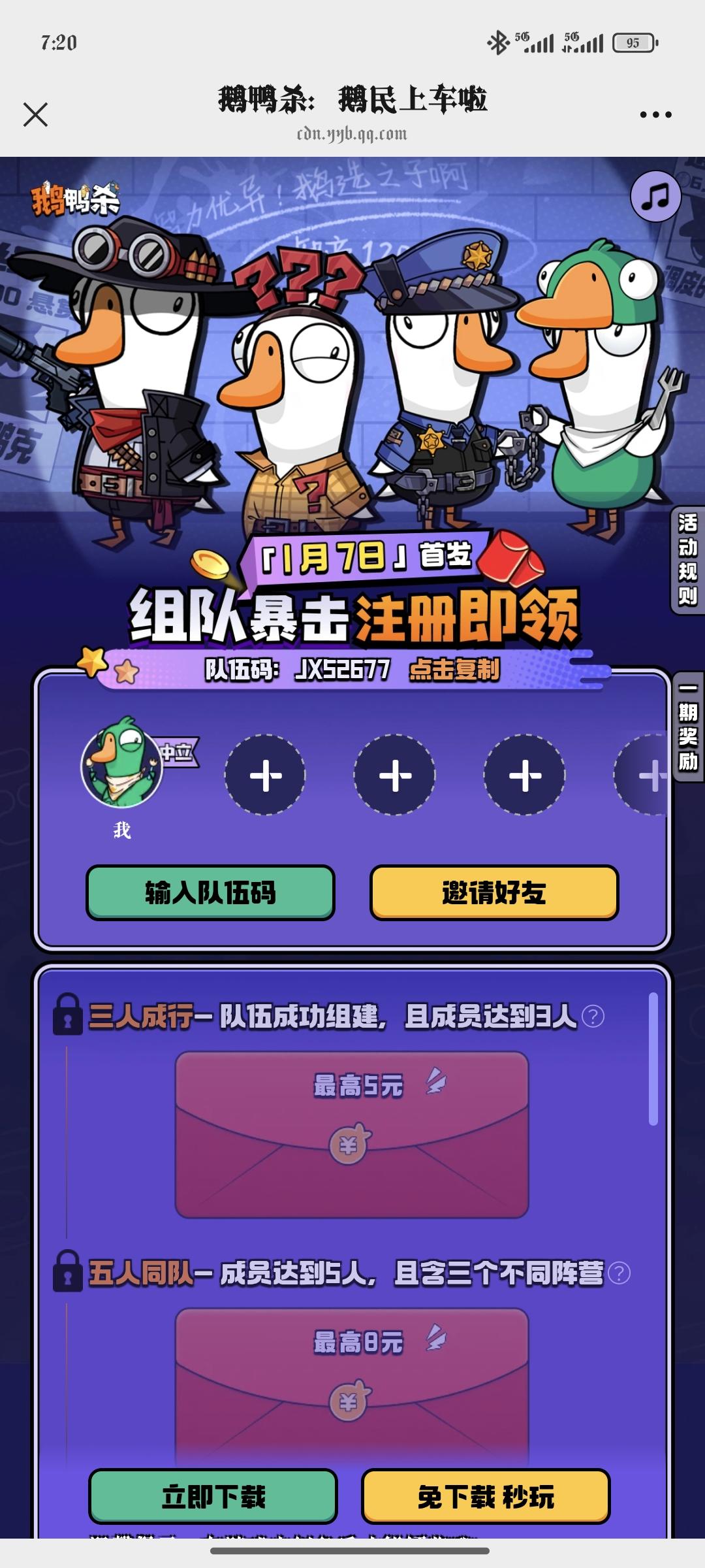 鹅村集结-暴击红包皮肤大礼https://cdn.yyb.qq.com/mole/app-activity/goose-goose-duck/index.html#/?channel_id=guanwang&team_id=JX52677队危速来