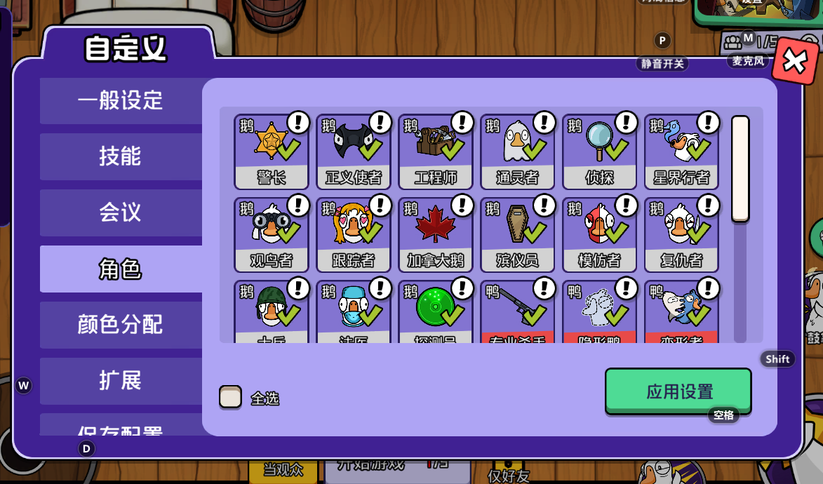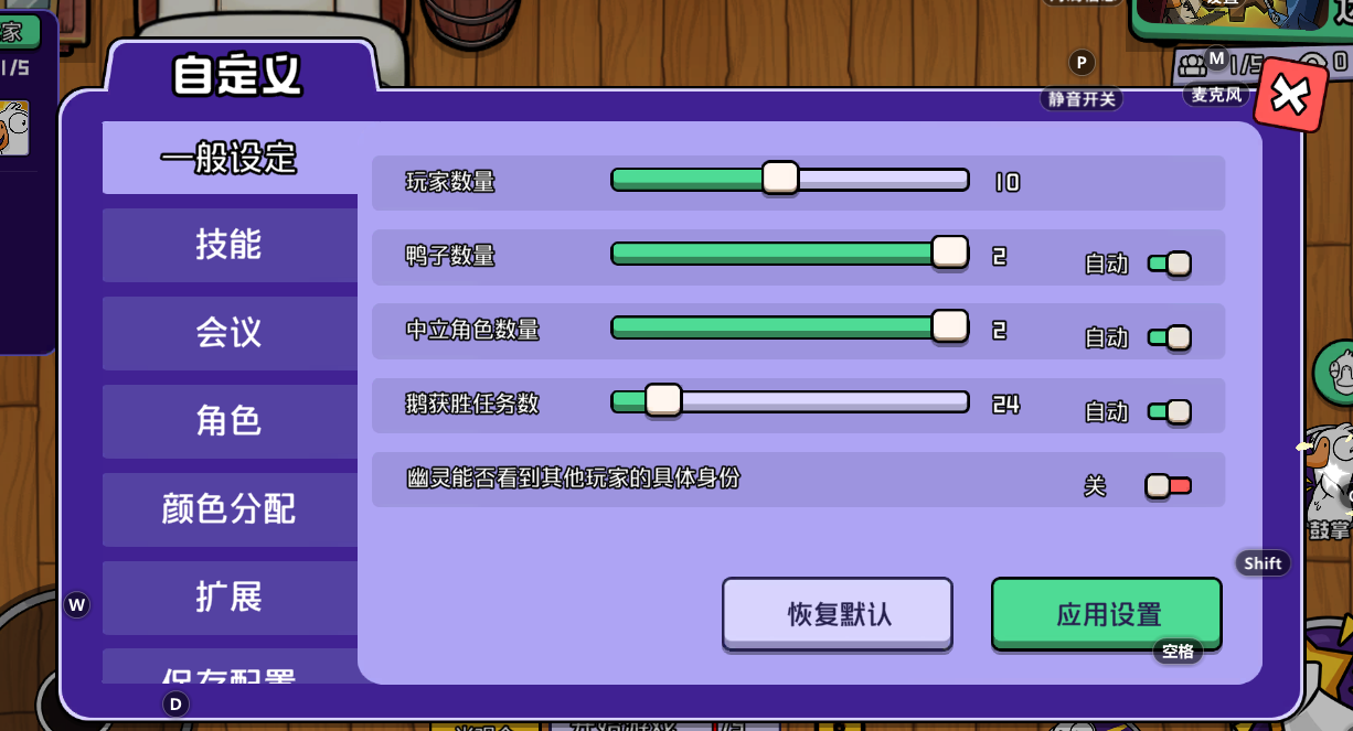 中立和鸭子的数量,受到玩家数量的限制。但有的时候有需求,要调多一点中立和鸭子,现在根本调节不了,自定义中能不能解除一下限制?还有自定义模式中,角色板子的问题。能不能有禁掉某些角色的功能,不让它出现。
