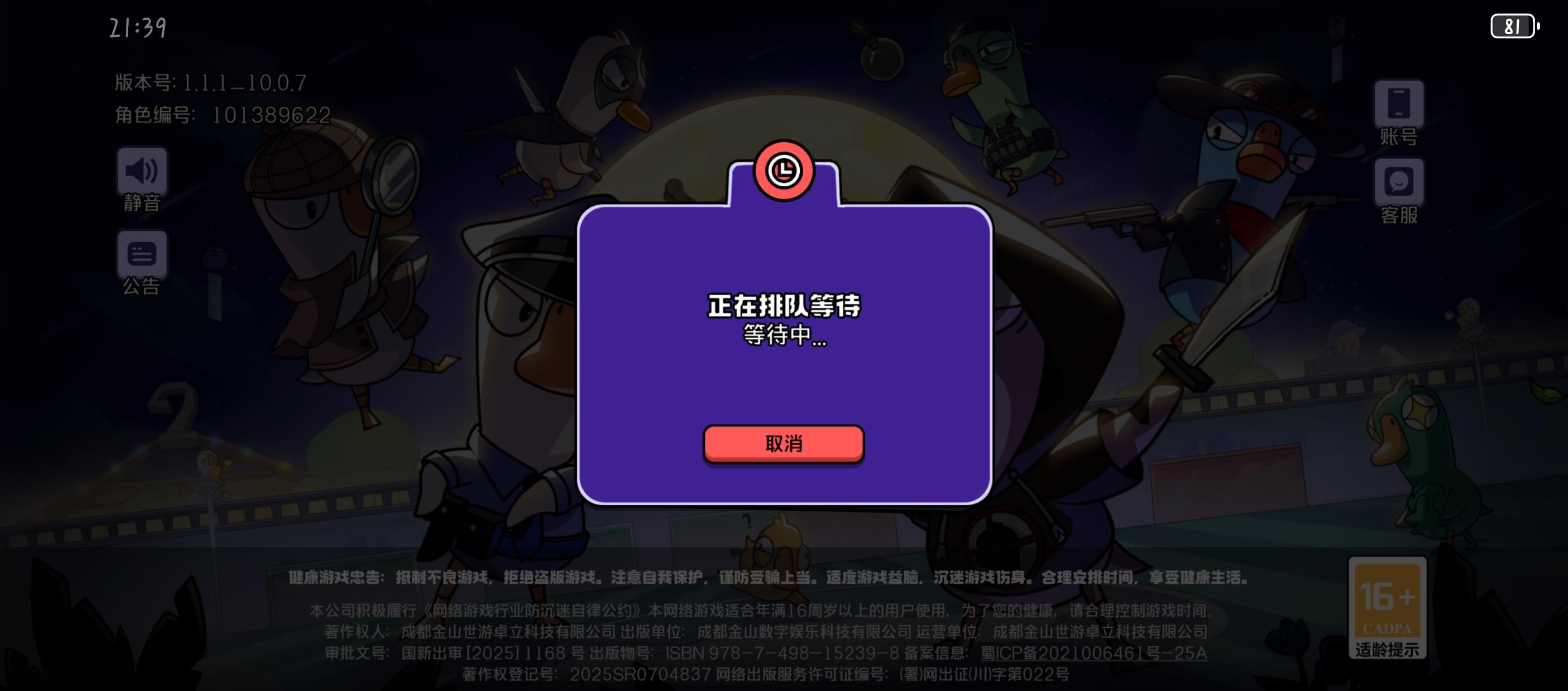 第一次玩,都没啥体验感,就正式两回,第一回刚点匹配,跟我说版本过低,然后我就回来更新了,更完进去发现我是匹配成功的,都在一轮发完了,我都没搞清楚我正义使者的身份,然后就被莫名其妙不懂的被嘎了,然后结束这回,这游戏还敢跟我说我消极,扣我10分,莫名其妙二回匹配了,这次倒玩上了,是鸭,嘎了俩人,然后发言阶段,好么,又卡了,卡了有快五分钟,等不了了,退掉游戏重新进入,发现我进不去了,然后不会又要说我消