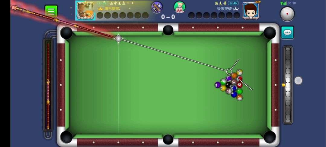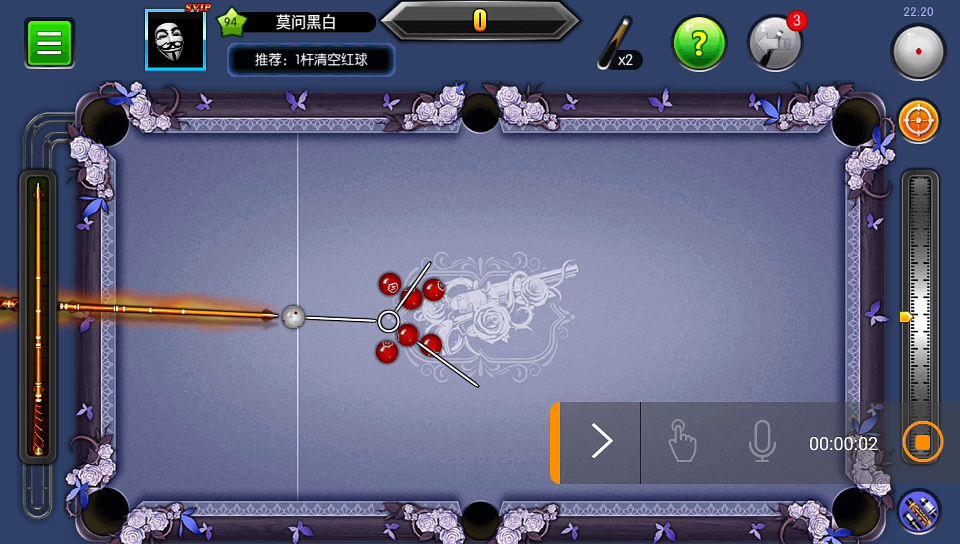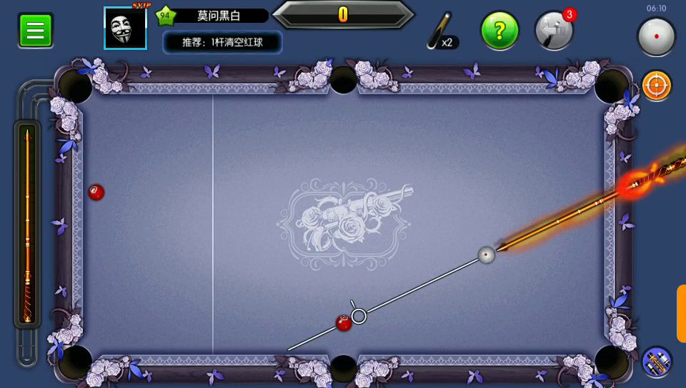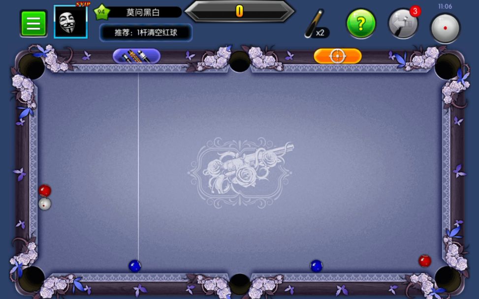 这是冠军之路豪华会所的第一个解谜关卡,这个就很简单了,直接瞄准中袋袋角把红球勾进去就可以了。