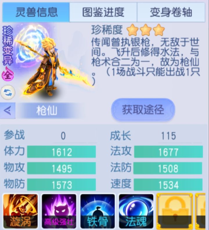各位少主晚上好,今天来聊顶尖法宠【枪仙】。说起枪仙,很多人疑惑——群攻宠不吃香的时代,为何它能脱颖而出?技能上看,秒4个单位虽少,不像雷帝能打七八个,但伤害更集中。关键在被动漩涡状态:目标附加漩涡,回合结束扣气血,克制重生技能——尤其保命(仅一滴血)。此外被动自带生存效果,被漩涡覆盖单位攻击此宠,很大概率一滴血,生存能力大幅提高。变异满技能为基础,硬性指标成长不低于113。资质优先法攻速度尽可