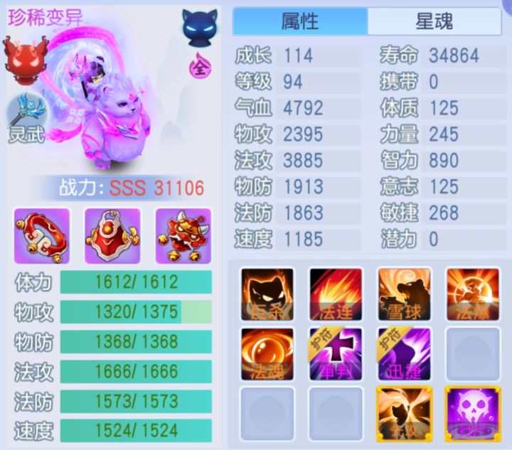 各位少主们好,今天我们一起来看看89级服战顶级单法宠物。宠物资质成长114距全满差1点,体力、法防资质全满,法攻无限接近全满,速度稍有遗憾。宠物属性主智力,输出爆炸,法攻3885。但生存速度弱势,可通过技能弥补。宠物技能雪球+超级巨杀+超级法连+超级法爆+超级法魂+超级先攻+高级行尸+护符(高级审判+高级迅捷)高级行尸弥补属性生存速度不足,不出意外保至少两次稳定出手。超级先攻不太适合当