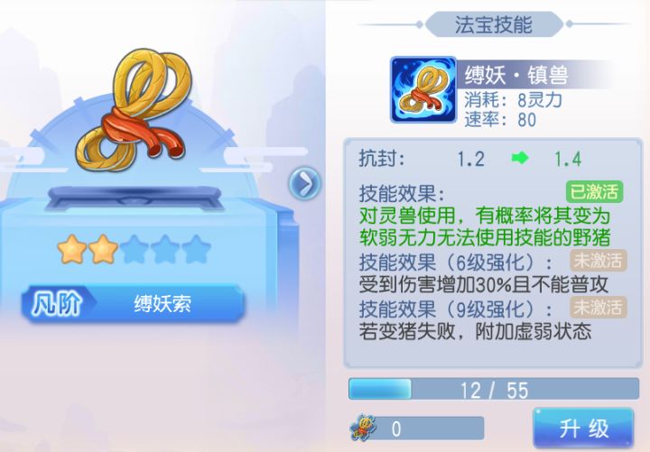 投稿@【文工团】小璐璐(本攻略纯属个人玩法总结观点,非代表官方)哈喽,大家好,我是文工团小璐璐。想必各位小伙伴们都对法宝系统有一定的认识,桃花源记目前有13个法宝,其中8个法宝带有主动技能,在升到3级时即可使用。下面,璐璐就带领各位小伙伴逐一认识下这8个主动技能,简要分析下技能情况,一家之言,各位大佬多多批评指正。【缚妖·镇兽】这个技能针对灵兽,可以封印技能。高级会有增伤和失败附加虚弱的
