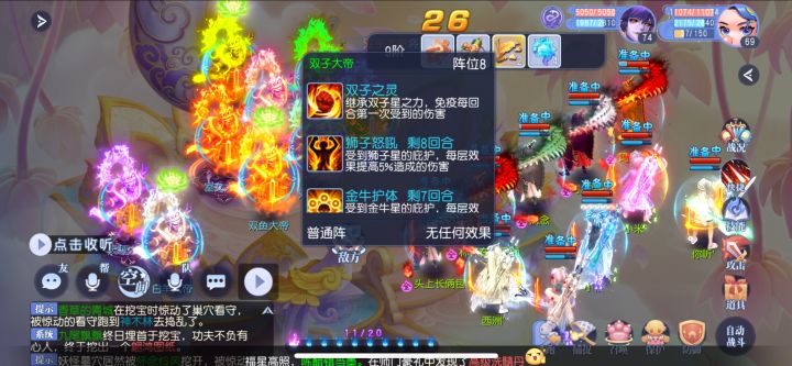 第四阶段(苍星大帝Ⅳ)第四阶段需要封印室女,集火第一排 第二个怪,之后看队伍输出情况分两种打法,因为带光环的怪物血量比小怪高,所以第一种是输出足够的情况,第二目标集火摩羯星,封印狮子星,因为摩羯炸蓝,回让你补蓝,浪费回合数,之后狮子,最后清小怪。第二种是输出不够的情况下,从苍星武将开始杀,集火一个一个杀。杀完小怪后会进入图二状态,这个回合里面,需要补状态,全队回蓝,人物上强化状态(三刀破斧、物理
