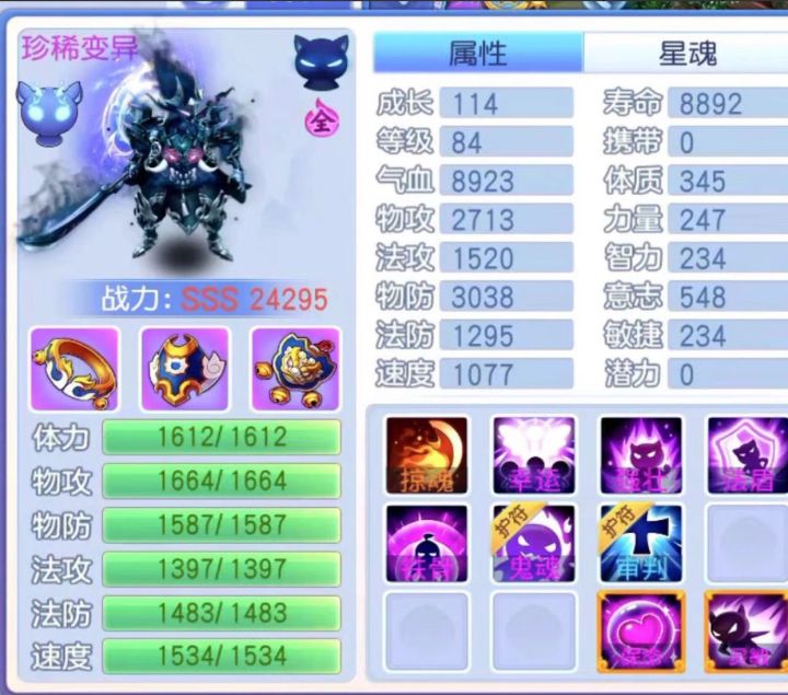 【幽冥鬼将】说起这个宝宝,我只能说是颜值超高!我相信每个男孩子都无法拒绝他手持大刀的模样,本来威风凛凛,没想到结果绝大部分的鬼将都沦为血耐宝宝……宠物资质:首先让我们一起来看一看宠物资质,成长114,距离全满差了一点,体力资质1612全满,物攻资质1664全满,速度资质1537全满,物防1587距离全满就差一点点,法防也是差了一点!整体资质我个人感觉十分完美!宠物属性:那么接下来我们再来