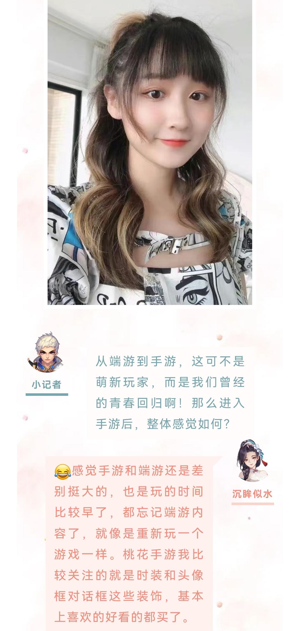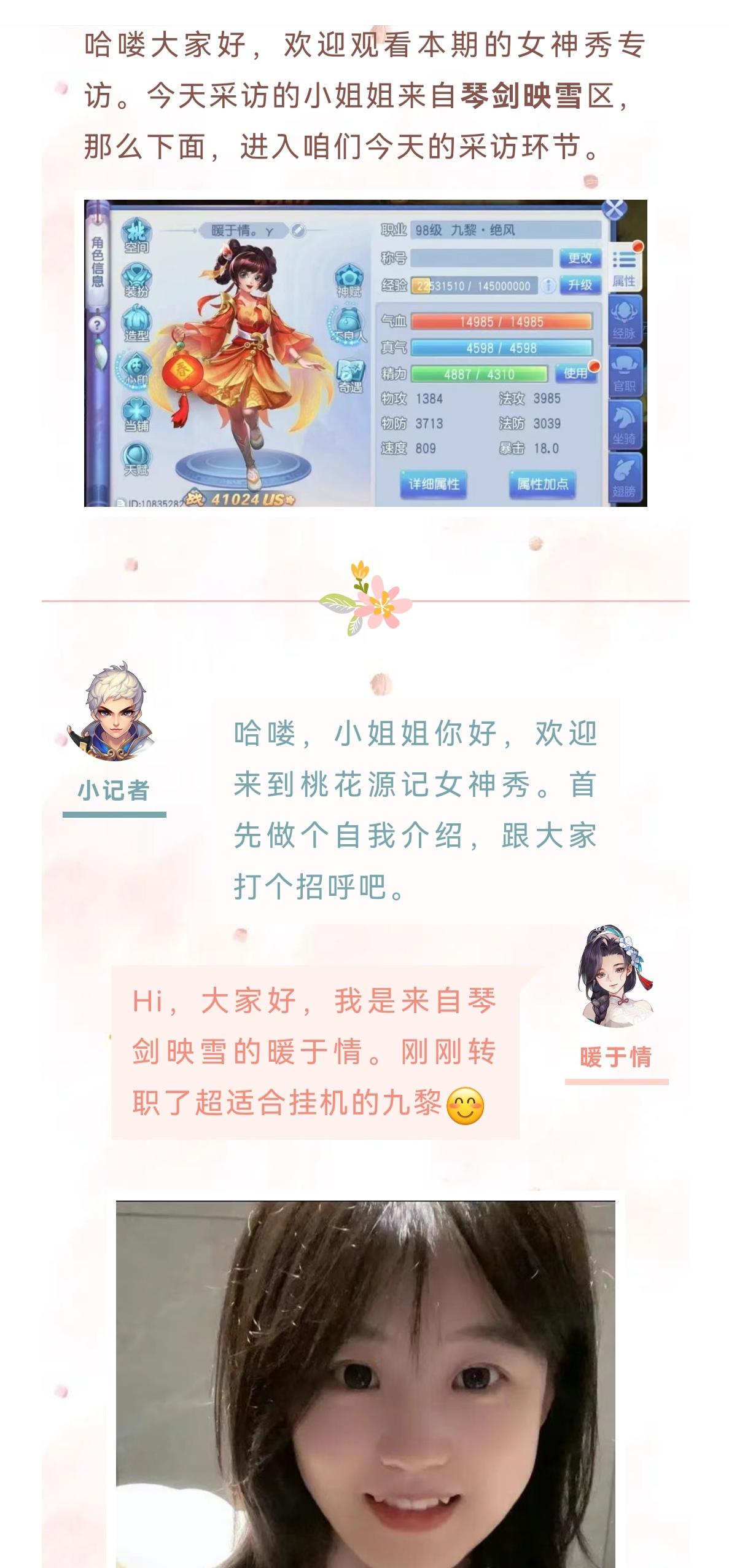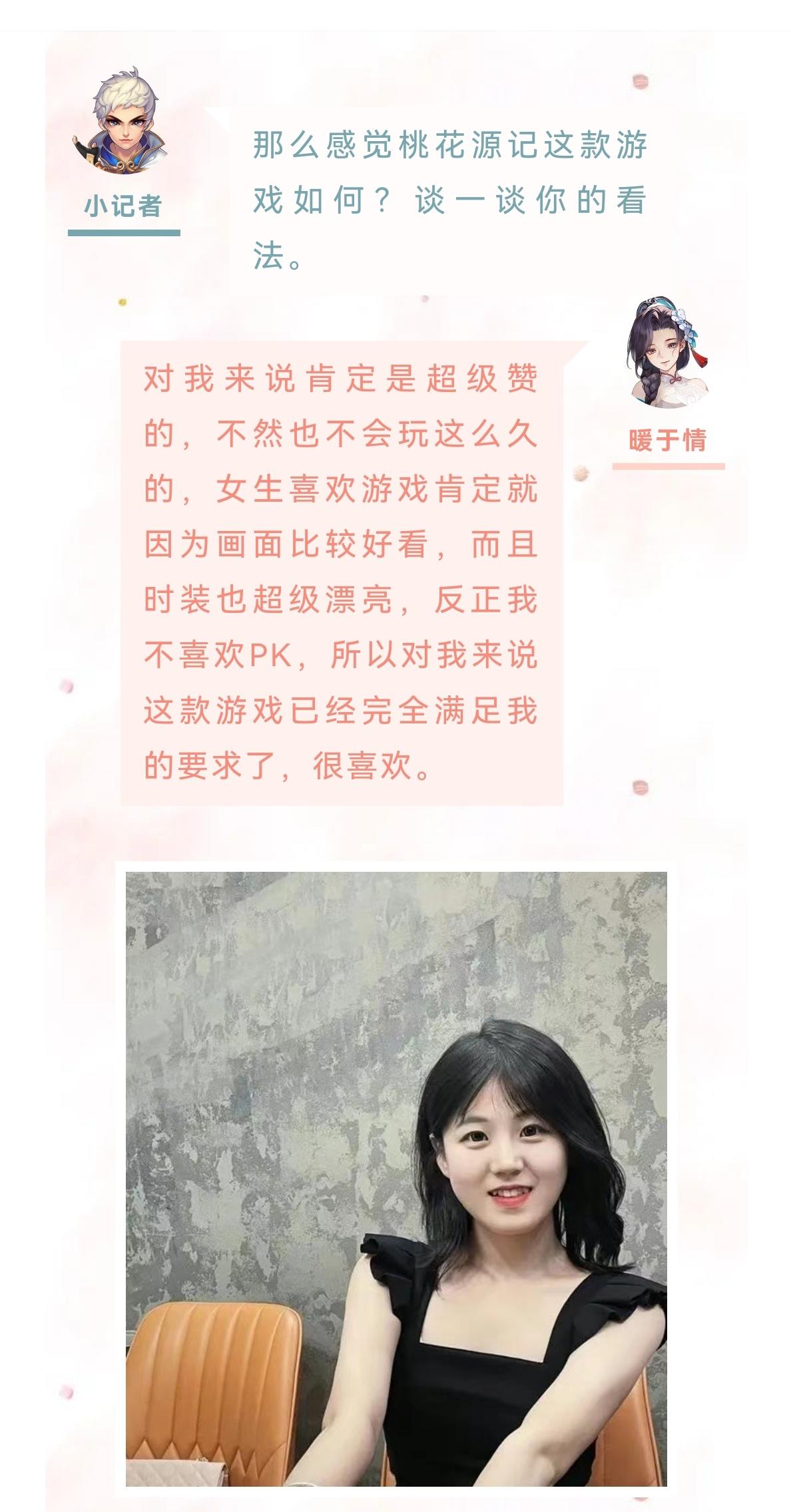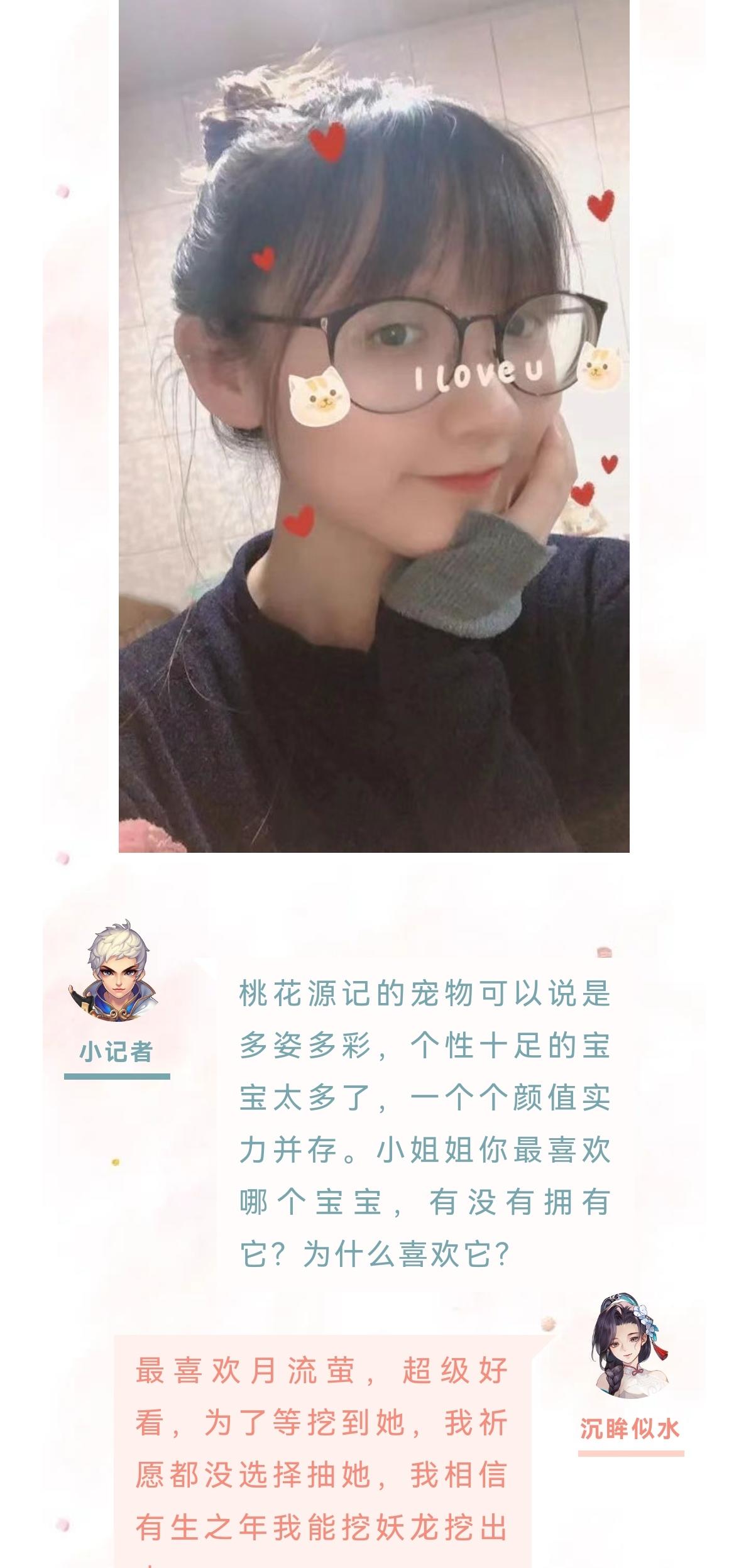 哈喽大家好,欢迎观看本期的女神秀专访。今天的小姐姐来自灿若流云。下面一起进入今天的采访环节。小记者:哈喽你好,欢迎来到桃花源记女神秀。首先做个自我介绍,跟大家打个招呼吧。静静宝贝儿⁰。:大家好,我是来自灿若流云的静静宝贝儿小记者:小姐姐接触桃花源记多久了,是在什么样的机缘巧合下来到我们这款游戏的?静静宝贝:之前呢我都没有玩过这样的手游的,都是玩的消消乐啊连连看,某天跟闺蜜吃饭,当时她正在玩