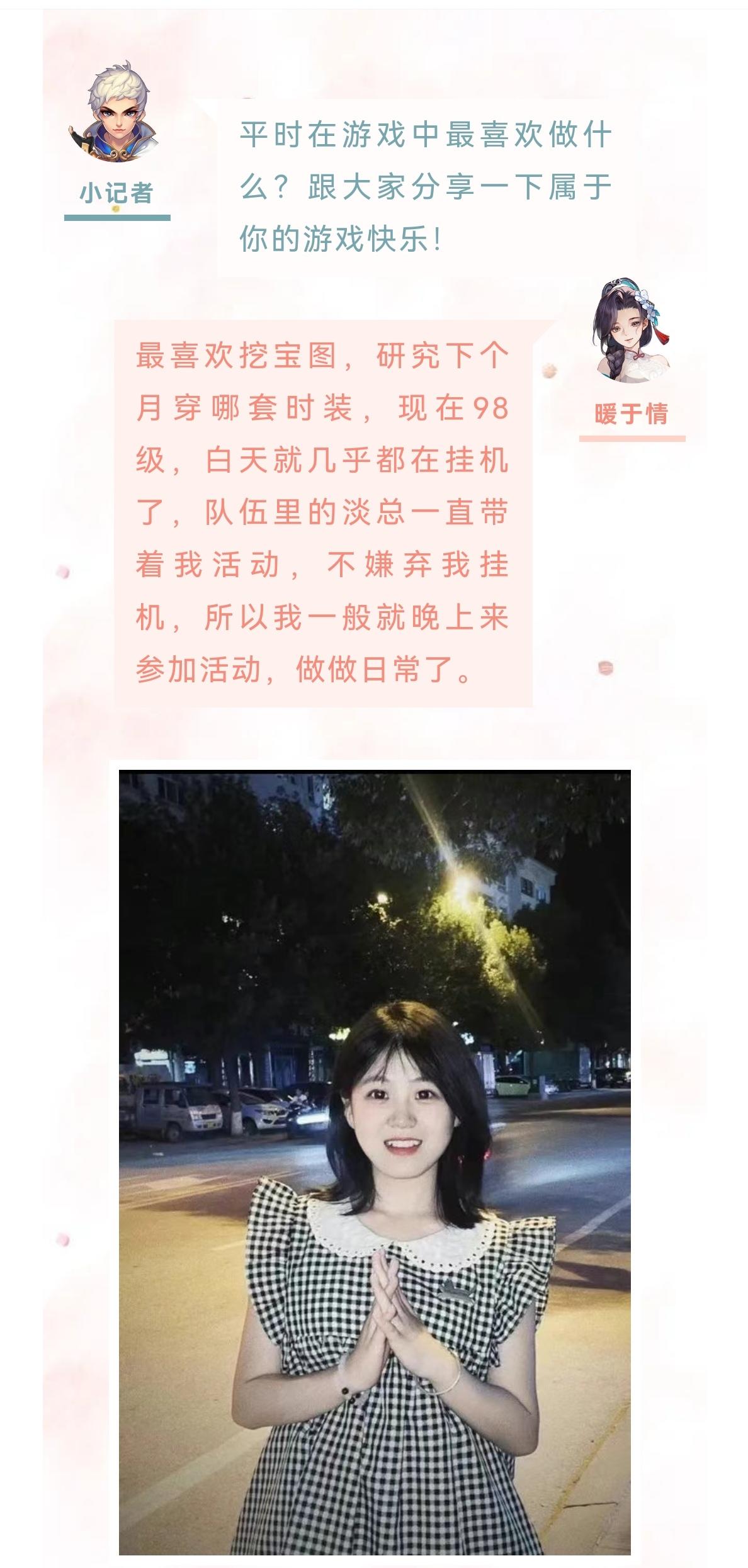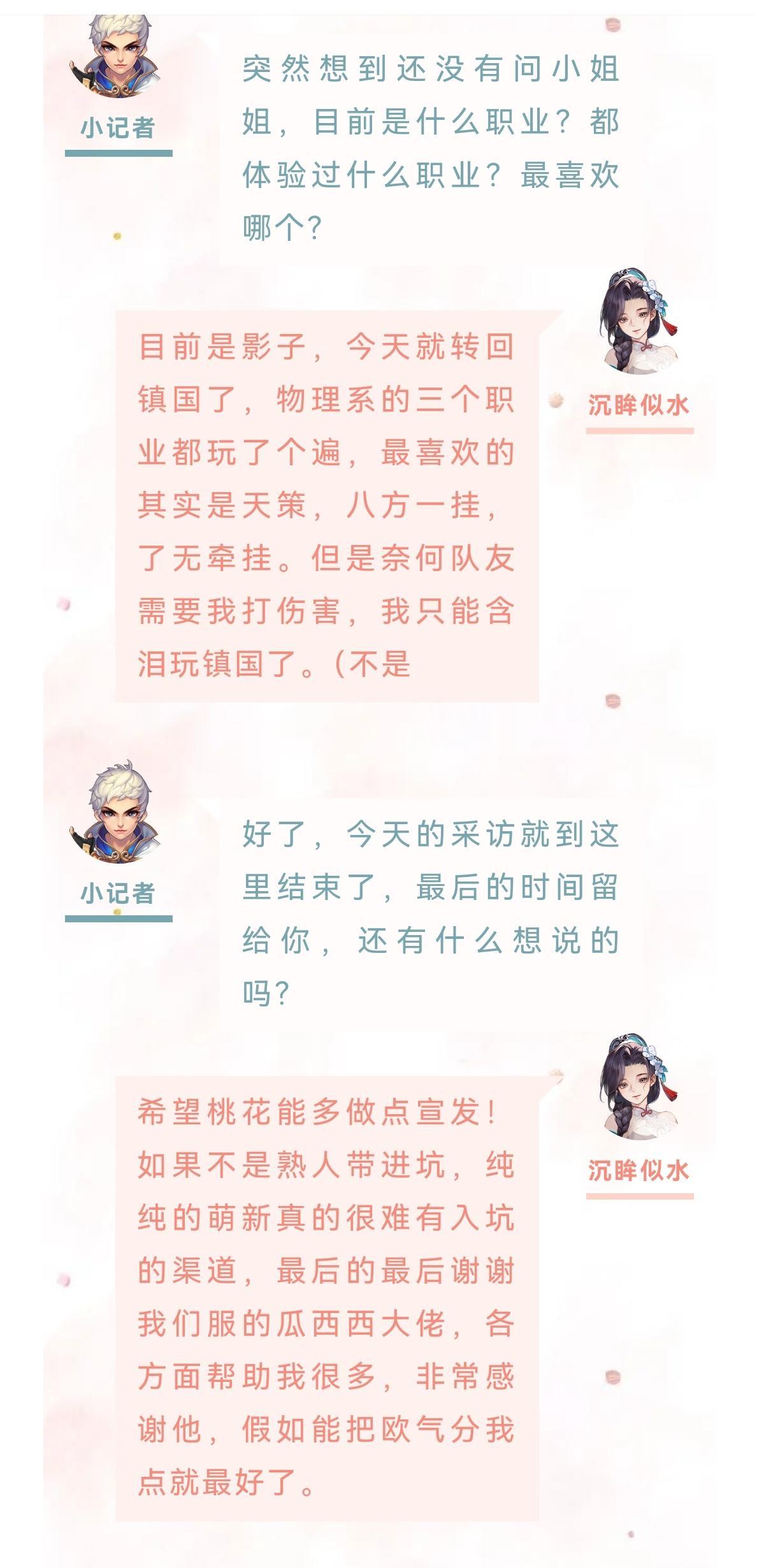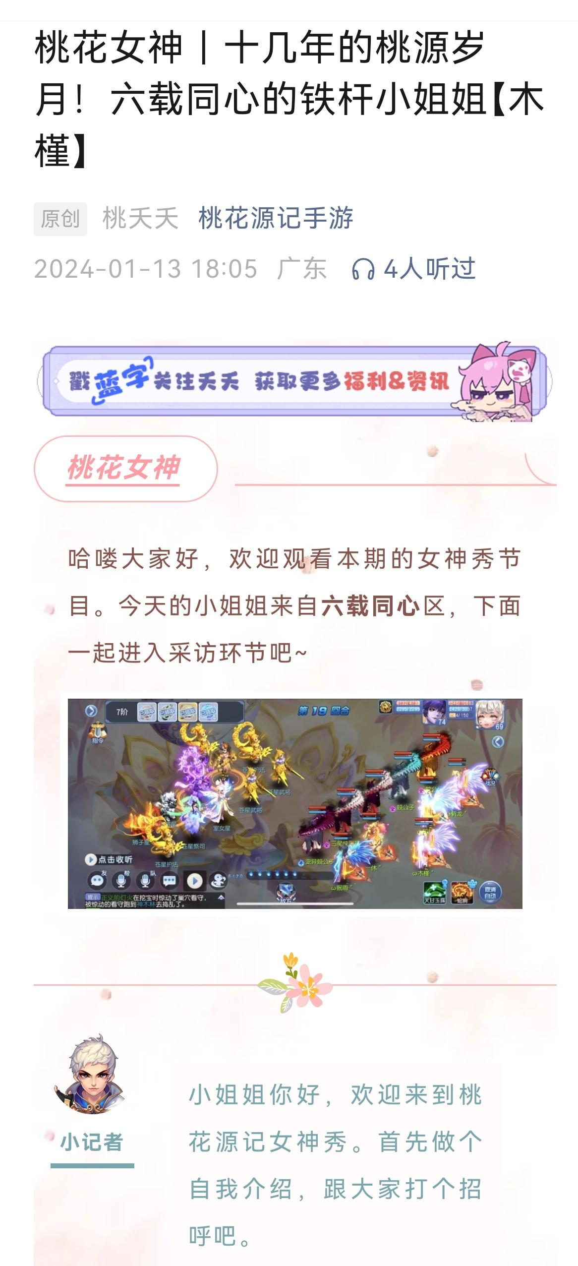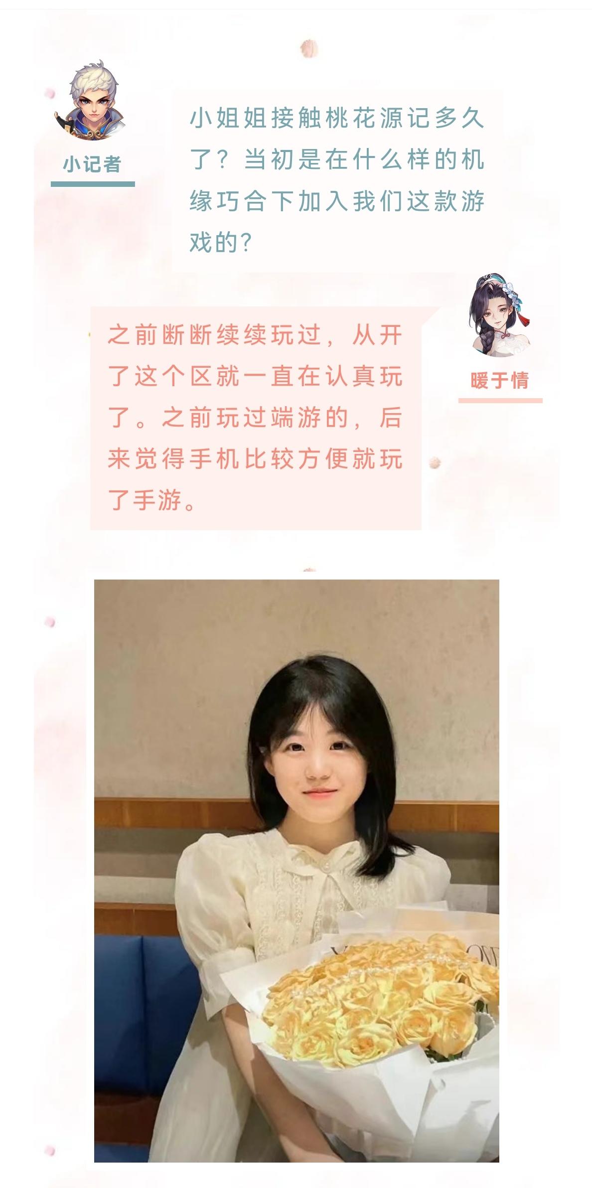 哈喽大家好,欢迎观看本期的女神秀专访。今天的小姐姐来自灿若流云。下面一起进入今天的采访环节。小记者:哈喽你好,欢迎来到桃花源记女神秀。首先做个自我介绍,跟大家打个招呼吧。静静宝贝儿⁰。:大家好,我是来自灿若流云的静静宝贝儿小记者:小姐姐接触桃花源记多久了,是在什么样的机缘巧合下来到我们这款游戏的?静静宝贝:之前呢我都没有玩过这样的手游的,都是玩的消消乐啊连连看,某天跟闺蜜吃饭,当时她正在玩