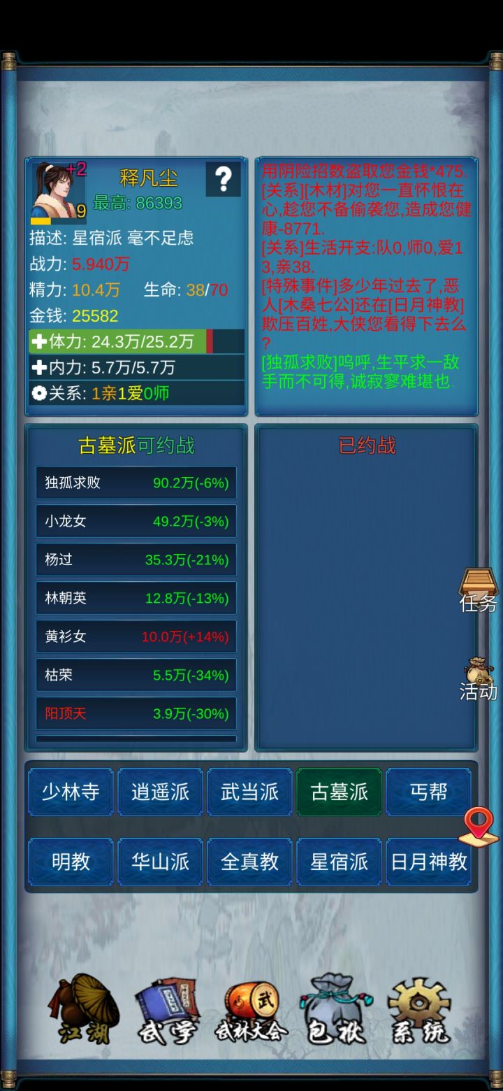 游戏功能已经非常完善了。提几个细小功能的建议。首先是开始游戏时候的自动吃药,设置为默认关闭状态。保留功能,让有需要的人手动开启比较好。第二就是任务栏,把放弃任务做一个按钮比较好,经常想点击任务快捷找人会误删任务有点烦人。缘分方面比以前丰富了很多。可以慢慢添加。最后希望游戏越做越好!