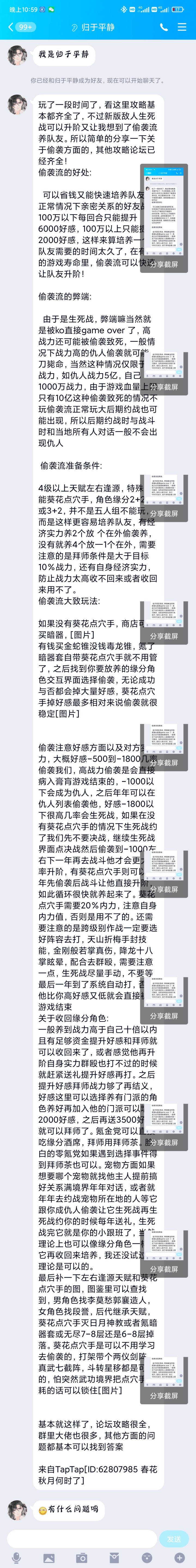 偷袭注意好感方面以及对方实力,大概好感-500到-1800几率偷袭我们,高战力偷袭是会直接病入膏肓游戏结束的,-1000以下会成为仇人,之后年年可以在仇人列表偷袭他,好感-1800以下很高几率会生死战,如果在没有葵花点穴手的情况下生死战约了我们先不要决战,继续生死战界面点决战然后偷袭到-1000左右下一年再去战斗他才会更大几率升阶,有葵花点穴手则可以同年先偷袭后战斗让他直接升阶,如此循环很快就养起来了。葵花点穴手需要20%内力,注意自身内力值,否则是用不了的。还需要注意的是跨级别作战一定要选好阵容去打,天山折梅手封技能,金刚般若掌真伤,降龙十八掌眩晕,配合去群殴,需要注意一点,生死战尽量手动,不要等最后一年到了系统自动打,否则他比你高好感又低就会直接被杀游戏结束