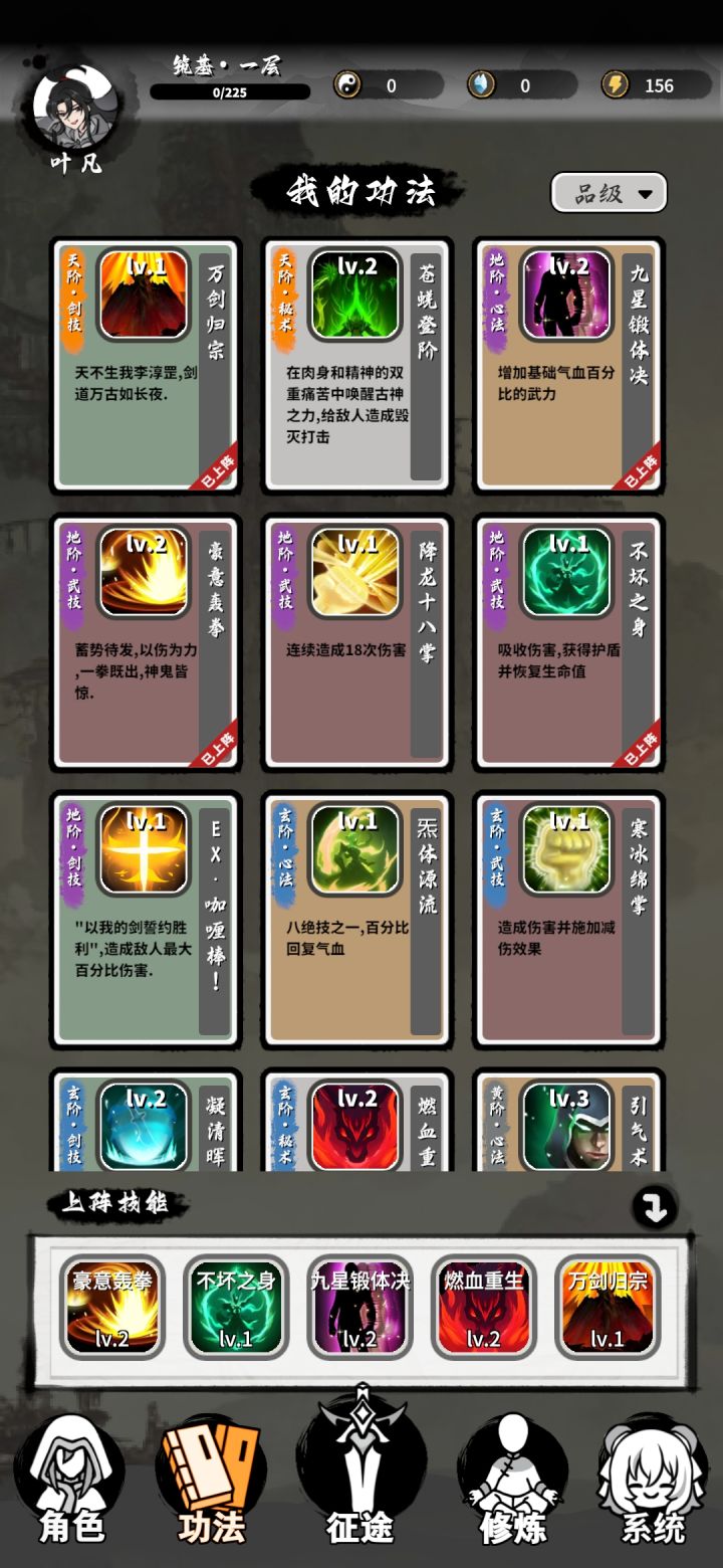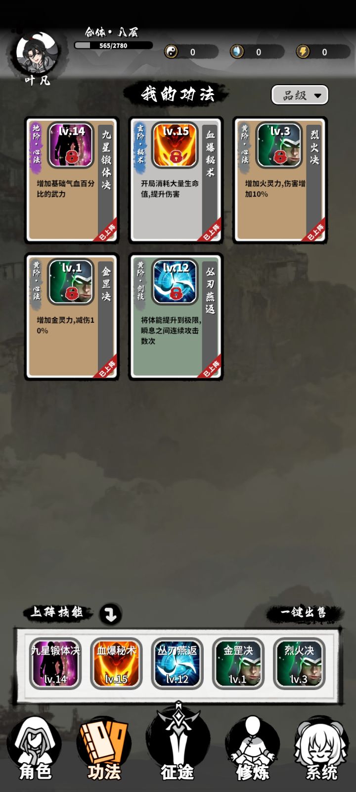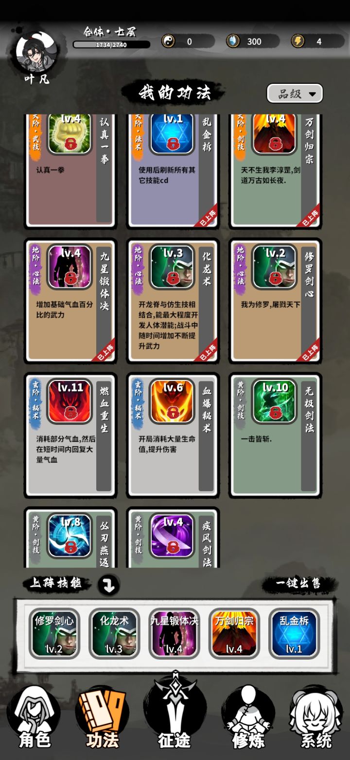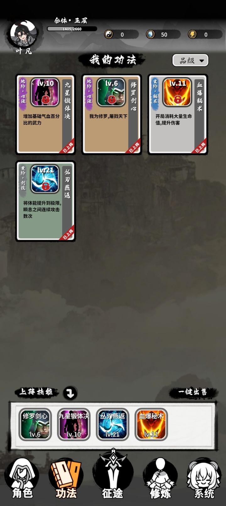 剑修秒杀流,修罗剑心+锻体+无极剑法固定,6,8,9章加血爆秘术固定,其它2个技能看怪技能上就好了,打排行榜是因为丛刃秒人好用,所以我把其它输出技能删掉了,剑修秒杀真的不要太爽,主要的还是无极剑法秒人。不过我还是喜欢体修乌龟流,无奈太弱了!希望快快增加更多玩法,真的好喜欢这个游戏