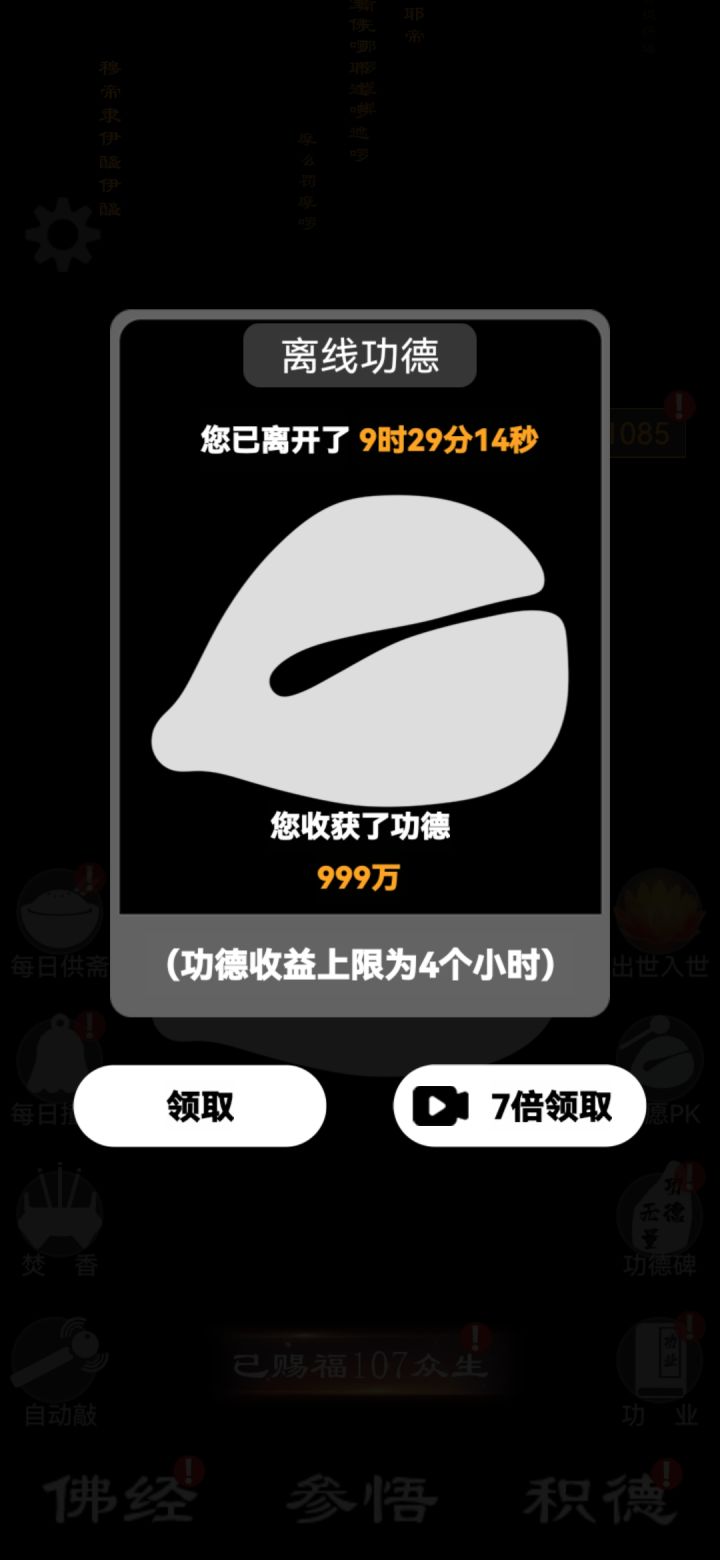 不知道出啥bug了 ,进游戏 ,离线奖励一弹就卡死。点击领取 或者看视频都没用