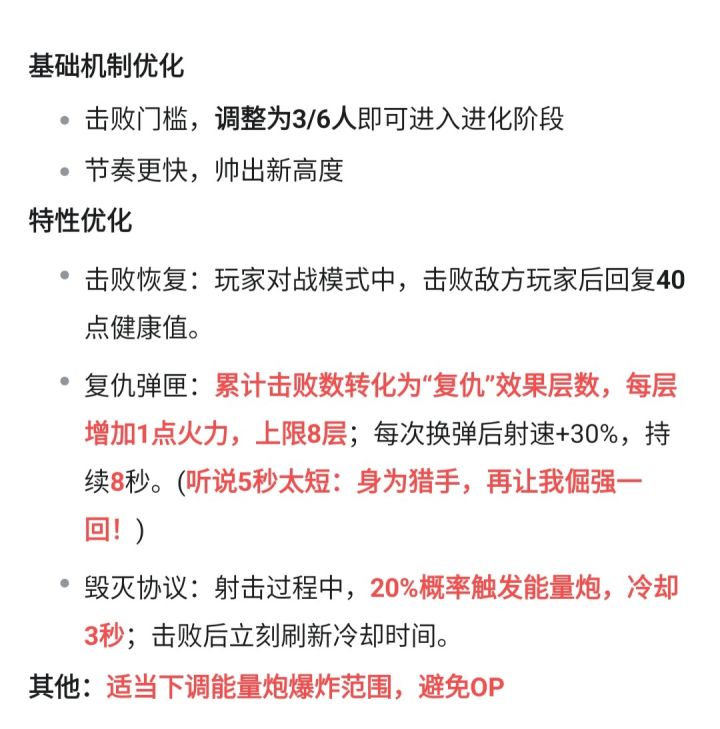 那就是武器加强前和加强后(削弱同理)的差距过于巨大例如糖果狙削弱前纯纯轮椅枪,狙图里面朝地板一打人直接嘎巴一下死了,而削弱后就成了纯纯路边一条(龙狙同理)魔音加强前路边一条都不如 加强后直接让雷成了小丑,因为雷往往都是开局向雷点雷人的,而开局往往又是魔音开技能的时候,所以一颗雷好不容易把护盾炸掉,可能还剩半血,苟起来十几秒就回满了论坛里面还有神人建议改的武器,嗜血冰炎等等,提出的建议比官方