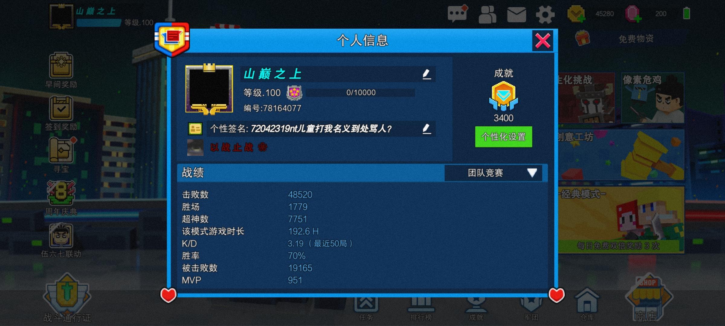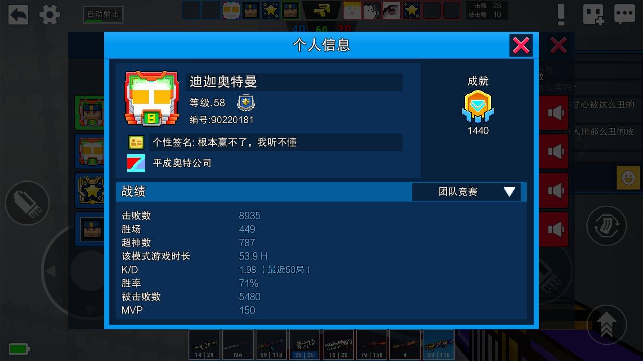 玩你游挺长时间了,也算是个半吊子大佬了大号三赛季枪神,小号双赛季枪神(图一图二)现如今你游有nt冒充我到处骂人?单挑被我大号8-1小号10-4完虐😅这货死不悔改,导致某些玩家早成误解开始骂我,已经严重影响我正常的游戏体验😅万望官方肃清这种像素射击毒瘤,还游戏一个清明正气的朗朗乾坤😏