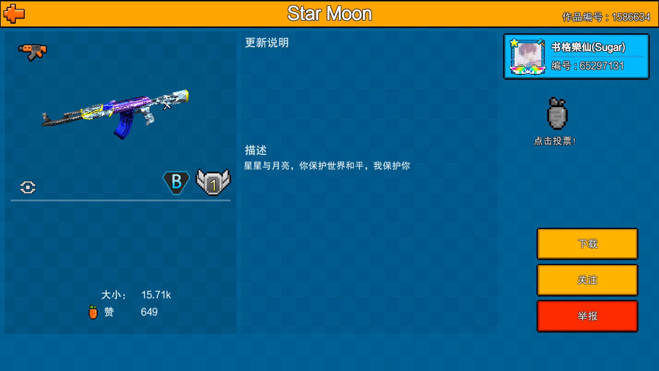 能给生化挑战加个无尽模式不?打完一个难度的生化挑战还得退出再重进一遍才能打下一个难度的生化挑战有点麻烦 然后是增加点可以在制作自定义地图时可以使用的方块 我看故事模式里的方块种类比做自定义地图时可使用的方块种类要多出一些 尽量不要“借鉴”别的游戏的武器 多自己原创些武器也少出点换皮武器 最后祝官方能把游戏越做越好!