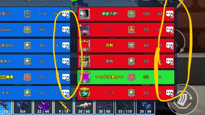 国服编号:103374 顾名思义,游戏中不分队伍,除了玩家自己以外的所有其他玩家都是敌人,即“只为自己而战”。每击败一名玩家,自己的分数(位于自己头像框下方)就会加一分。 图2中红圈圈出的数字指当前房间所有玩家的分数中的最高分数;白圈圈出的数字指胜利分数,即率先达到此分数的玩家获胜(此胜利分数在各地图中基本固定为20分)。 注意:①阵亡之后,等待5秒钟即可复活,复活后维持2秒钟左右的“无敌”