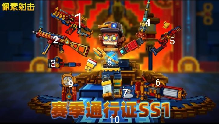 1.龙之吐息的皮肤2.ump45皮肤3.荒岛铲子皮肤4.新通行证武器.刀5.新通行证武器.喷子6.(图3或者图4)有30%的概率新通行证武器.重机枪7.(可能是噗噗的皮肤)或者是新通行证.手雷 8.角色形象9.披风掉落物10.飞行器、荒岛飞行器#像素射击